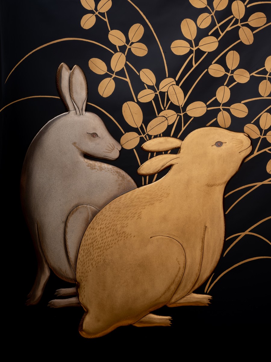 Large and wide tray, in Japanese lacquer, black, gold and silver according to the techniques of hiramaki-e and takamaki-e. It offers a setting of two large rabbits in autumn grass looking at the sky, under a large silver crescent moon, on a black background. Length: 66cm x Width: 44cm. With a base. Japan Edo (1603-1868) 19th Century