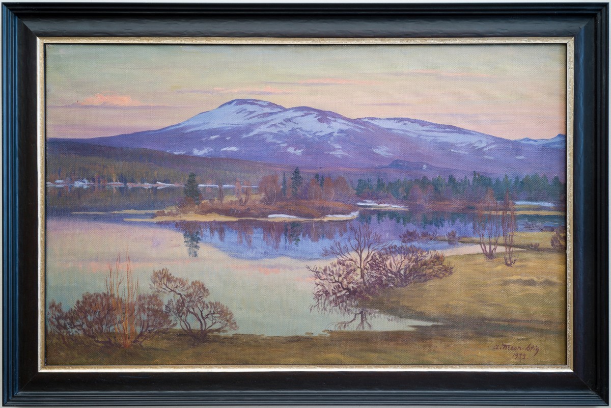 Karlsson-Stig lived in the area where the painting was created and was captivated by the beauty of the surrounding landscape near Undersåker and Åre. The painting portrays a vast landscape with the Indalsälven lake in the foreground. The reflection of the mountains in the water is beautifully captured with fine details. The background shows the mountain Välliste in a blue-purple tone, and the calm sky with a few clouds complements the scene. The trees in the painting have a green and purple hue, which adds depth to the painting.