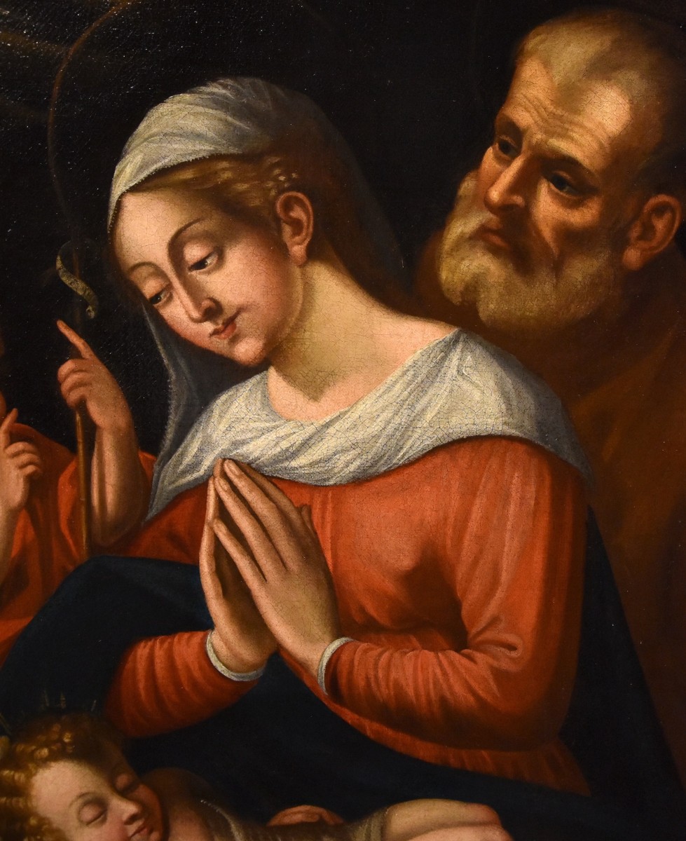 To enrich this canonical Holy Family appears on the right the little Saint John the Baptist who, as if wanting to address the viewer directly, makes a sign of silence with his hands so as not to disturb the little sleeper and to invite him to contemplate the scene with devotion.
