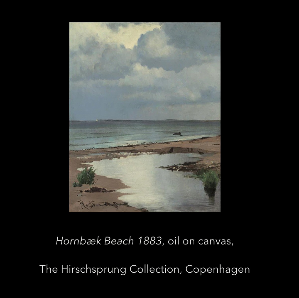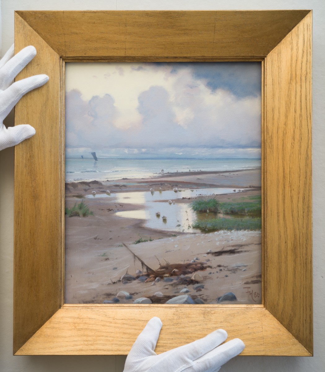 We are pleased to present a striking pastel by the Danish artist, Frants Henningsen (1850-1908), titled "A Summer's Day on Hornbæk Beach" dated 1886. The scene is from Hornbæk Beach in Denmark, featuring a beach with some pooled water, a few green grass plants, followed by the sea with sailboats, and land visible on the horizon. The water reflection in the puddle on the beach and in the sea is exceptionally beautiful, reflecting the sky, which has a few clouds. This is a motif that the artist revisited several times during the 1880s, including a larger oil painting executed in 1884, sold at Christie's in 2021, and another one from 1883 in the museum collection: The Hirschsprung Collection, Copenhagen. Our pastel is undoubtedly the brightest of those we could find; it is strikingly beautiful and in exceptionally good condition. The artwork comes in a beautiful handmade oak gold frame by Stockholms Bildhuggeri.