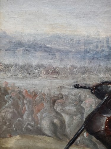 Here, he brilliantly portrays a battle scene, with the movement of horses throwing themselves into battle in the background.