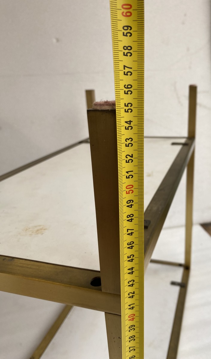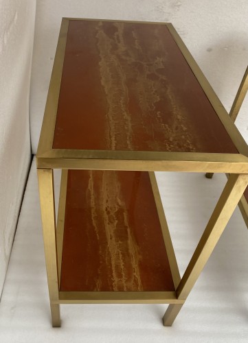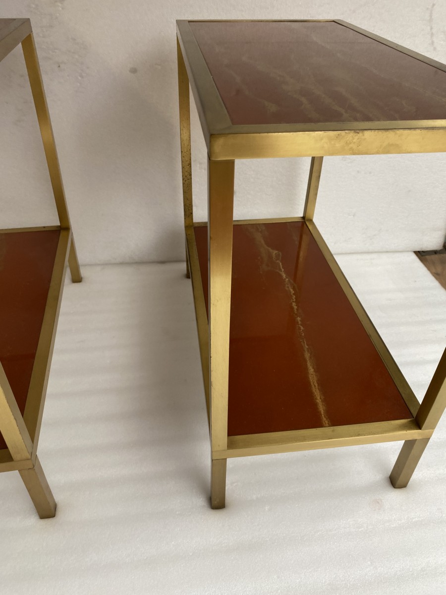 Pair of side tables in brass with 2 levels wood covered with orange lacquered melamine with gold decoration,