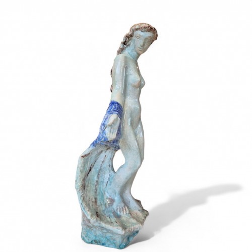 Ceramic sculpture in the round covered with cracked creamy white, green and blue enamel (slight chip at the base and firing cracks consistent with the photographs). Signature intaglio on the back.