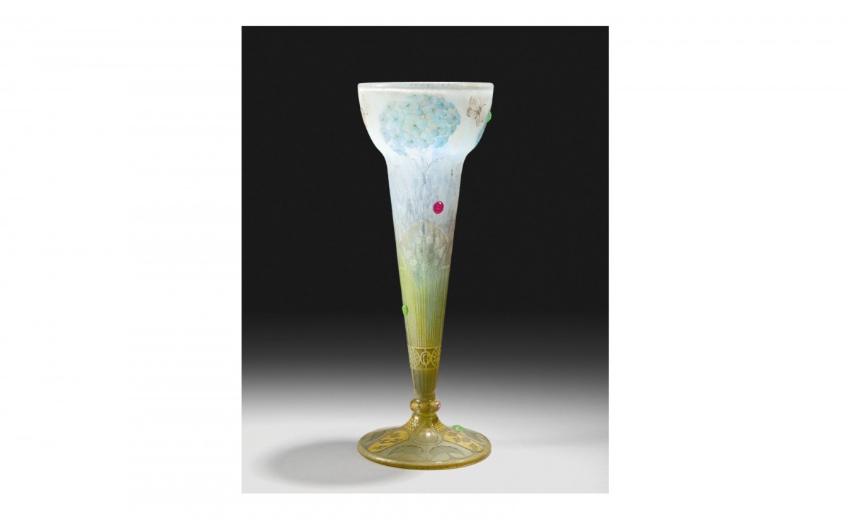 Large conical vase on pedestal. Industrial print in sky-blue glass on a white background shaded green and orange with a frosted surface. Decor of hydrangeas and two butterflies, acid-etched and hot-glazed. Hot-applied color cabochons representing the heart of the flower. Gold-embellished pedestal.