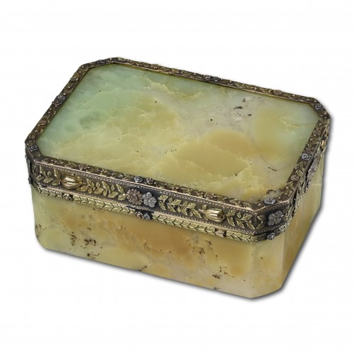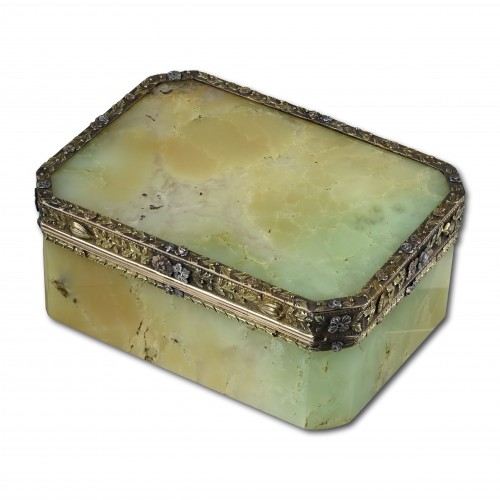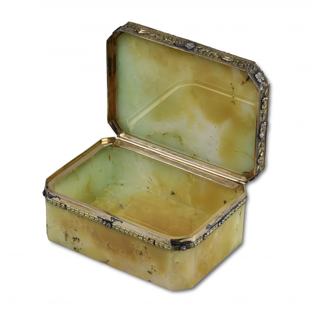 The body of the box is carved from two pieces of unusual yellow and green chalcedony, most likely chrysoprase and mounted with vari-coloured gold mounts decorated with fruits and flowers.