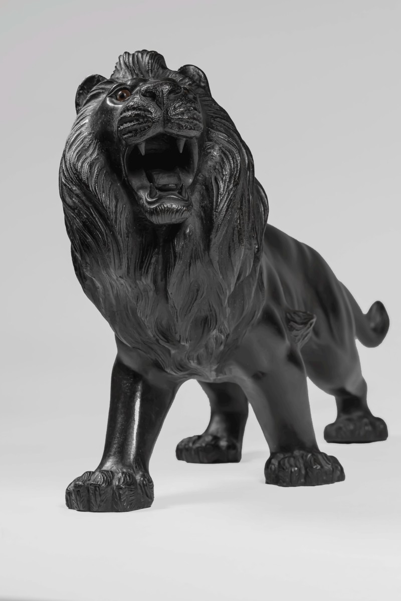 Meiji period Japanese bronze sculpture of a lion with inlaid eyes signed on the underside.