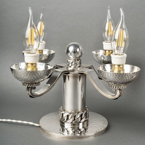 Art Deco pair of candelabras made in hammered silver plated metal and chains by Jean Desprès.
