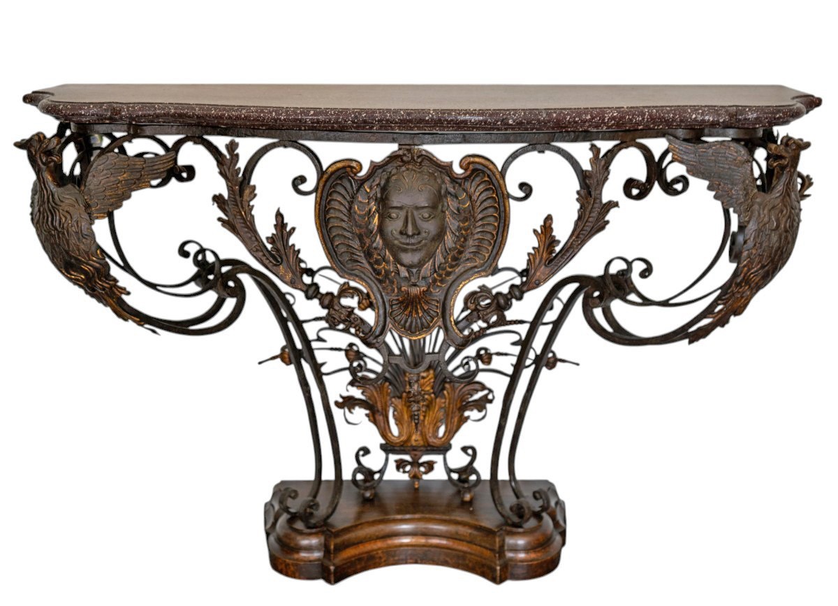A rare and very elegant Louis XV wrought iron, parcel gilt and Egyptian porphyry console table, the moulded shaped porphyry top above a conformingly shaped plain metal frieze above a central and characterful partly gilded male mask issuing from shell motifs flanked by open-work acanthus-wrapped scrolls that are linked to four supporting open-work serpentine legs, headed by naturalistic eagles with spread wings, the male mask head above a gilt acanthus leaf spray that issues bullrush-like sprigs and is placed upon an open-work scrolled plinth with scrolled feet on four balls flanked by the supporting legs with scrolled feet upon a later shaped wooden base