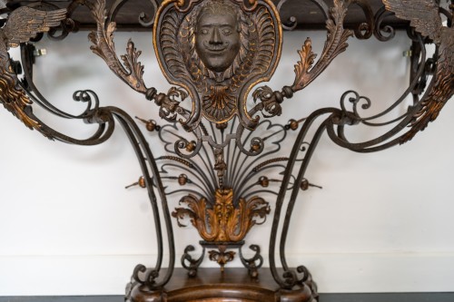 When polished, painted, gilt, silvered or applied with repoussé tole, wrought iron takes on a new vitality, full of warmth and richness that could rival works made of carved wood adorned with gilt bronze mounts. Furthermore, wrought iron furnishings provided a durability that wood was unable to offer. This material, when used in furniture, therefore became a sophisticated and rare component of luxurious French interiors from the early Louis XV period onwards. In addition, the physical strength of the wrought iron led to a preference for consoles fixed to the wall, playing with the contrast between the weight of the stone top and the lightness of the open-work design, a feature that carved giltwood was rarely able to achieve.