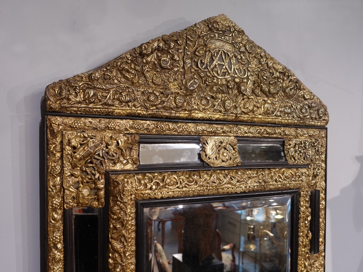Large mirror with glazing beads and a Louis XIV period ebonized wood frame veneered with embossed brass.