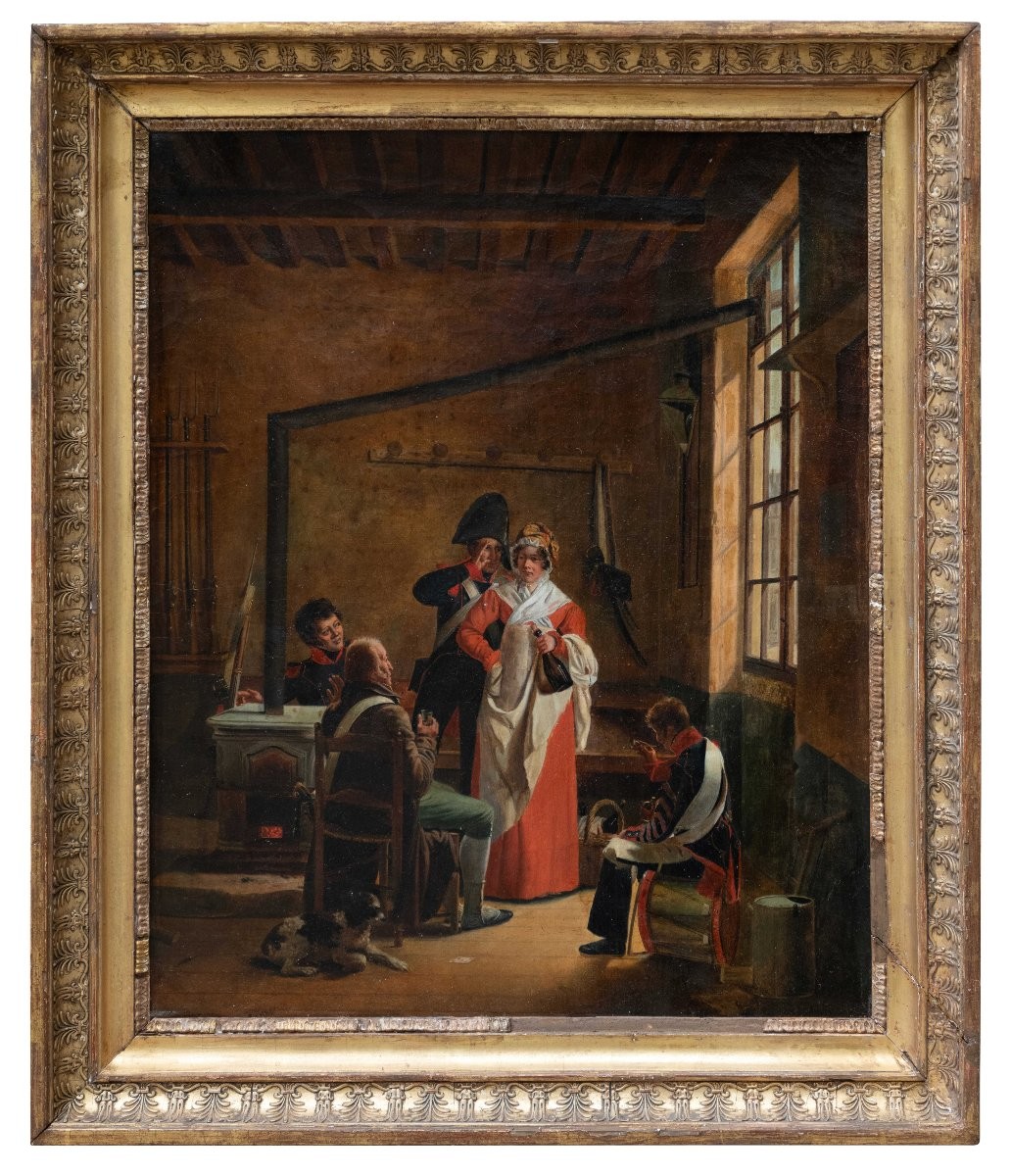 La Marchande d’eau-de-vie au corps de garde and L’Interrogatoire au corps de garde thus bear witness to the taste for genre painting under the Restoration, a broad domain often overshadowed by grand Romantic compositions and history painting. These are also among the earliest preserved works by Duval Le Camus, marked by an almost northern austerity strikingly close to the compositions of Martin Drolling — an austerity that softens, warms, and fades as taste evolves and the painter gains mastery in the decades that follow.