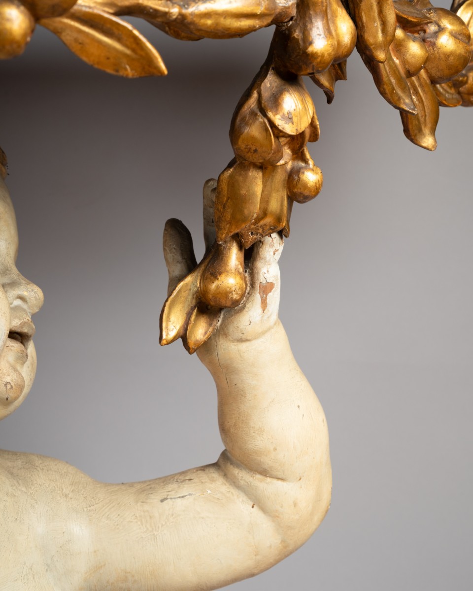 Our pair of putti consoles embodies the quintessence of Roman Baroque art. The large figures on our bases were designed to showcase the luxurious marble tops as well as the collections of bronzes and busts that sat on them. Generally positioned in the grand galleries of Italian palaces, they allowed the public to admire the antique collections and thus affirm the power of their owners. The finest example of this art is found in the Colonna Palace, where the seventy-six-meter-long grand gallery probably inspired the Sun King for his Palace of Versailles. The presence of the original furniture still allows us today to admire the series of large consoles with figures of captives that take place on either side of the gallery. The unfortunate Turks defeated at the Battle of Lepanto by Marcantonio Colonna were condemned to support the heavy antique alabaster tops and the endless series of busts of Roman emperors placed on them. It was in fact in Rome, where a profusion of residences with large galleries were built during the Baroque period, that this fashion was most successful. The Palazzo Spada, Doria Pamphili, Corsini, Farnese, Barberini, etc., displayed such consoles before being brought up to date in the 18th century with series of more classical consoles. The extreme rarity of this type of table also comes from the fact that they required very large sections of wood as well as precious marble that all the Roman nobility fought over. Finally, it was necessary to hire a great sculptor because a simple carpenter could not carry out such a work of sculpture where proportions and grace are essential. Often the very harsh theme of the captive or the slave grimacing under the weight of his load is used for this type of work, but our consoles present putti with playful and laughing airs who support the weight with great joy while holding a garland of fruit. The theme of the harvest of fruits and abundance is a recurring theme in Rome, Lazio being an agricultural land par excellence but here it also refers to the Garden of Eden, with childish and innocent telemanons who do not bear the heavy burden of the earth but rather the heavenly paradise, which gives our consoles a strong religious symbolism in accordance with all the Roman creations of the Baroque period.