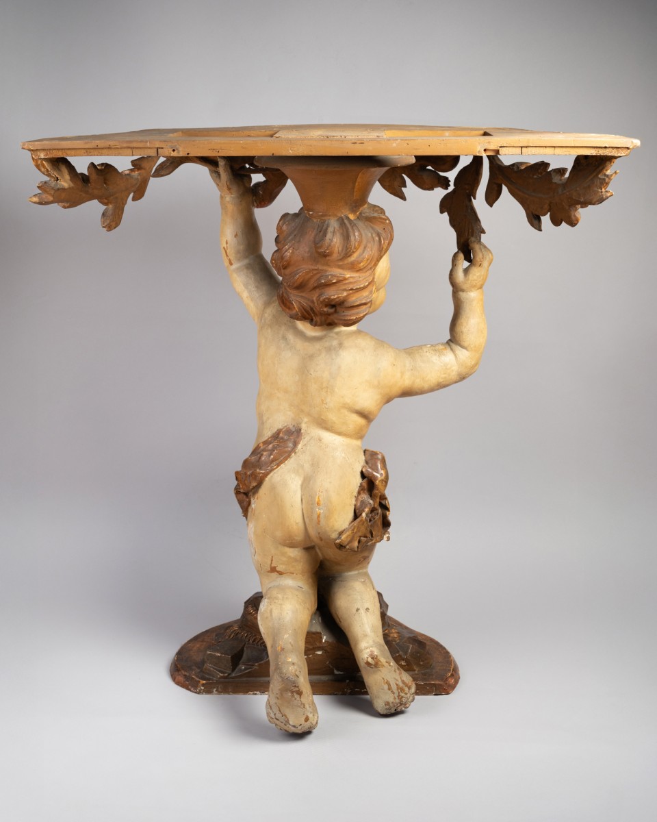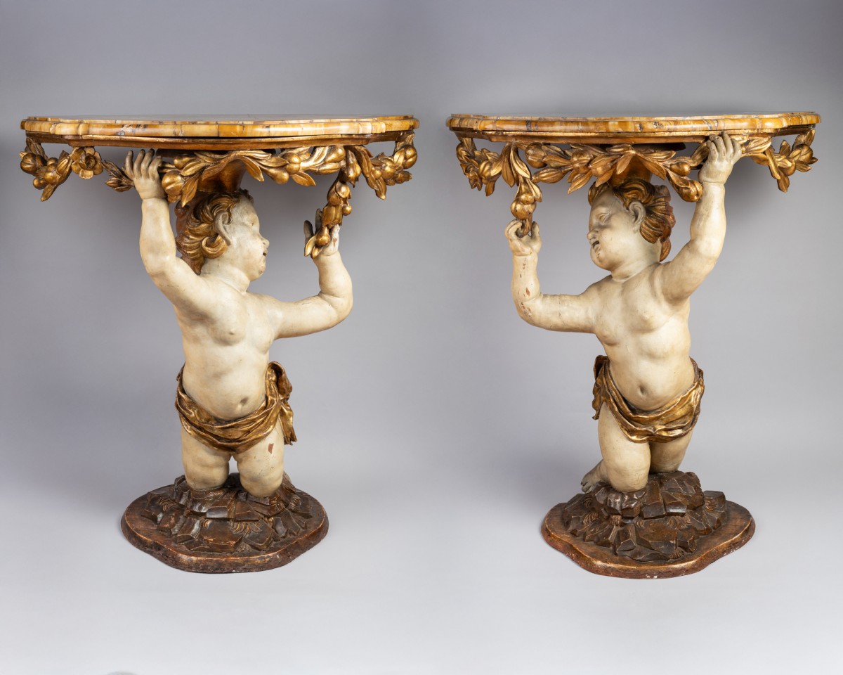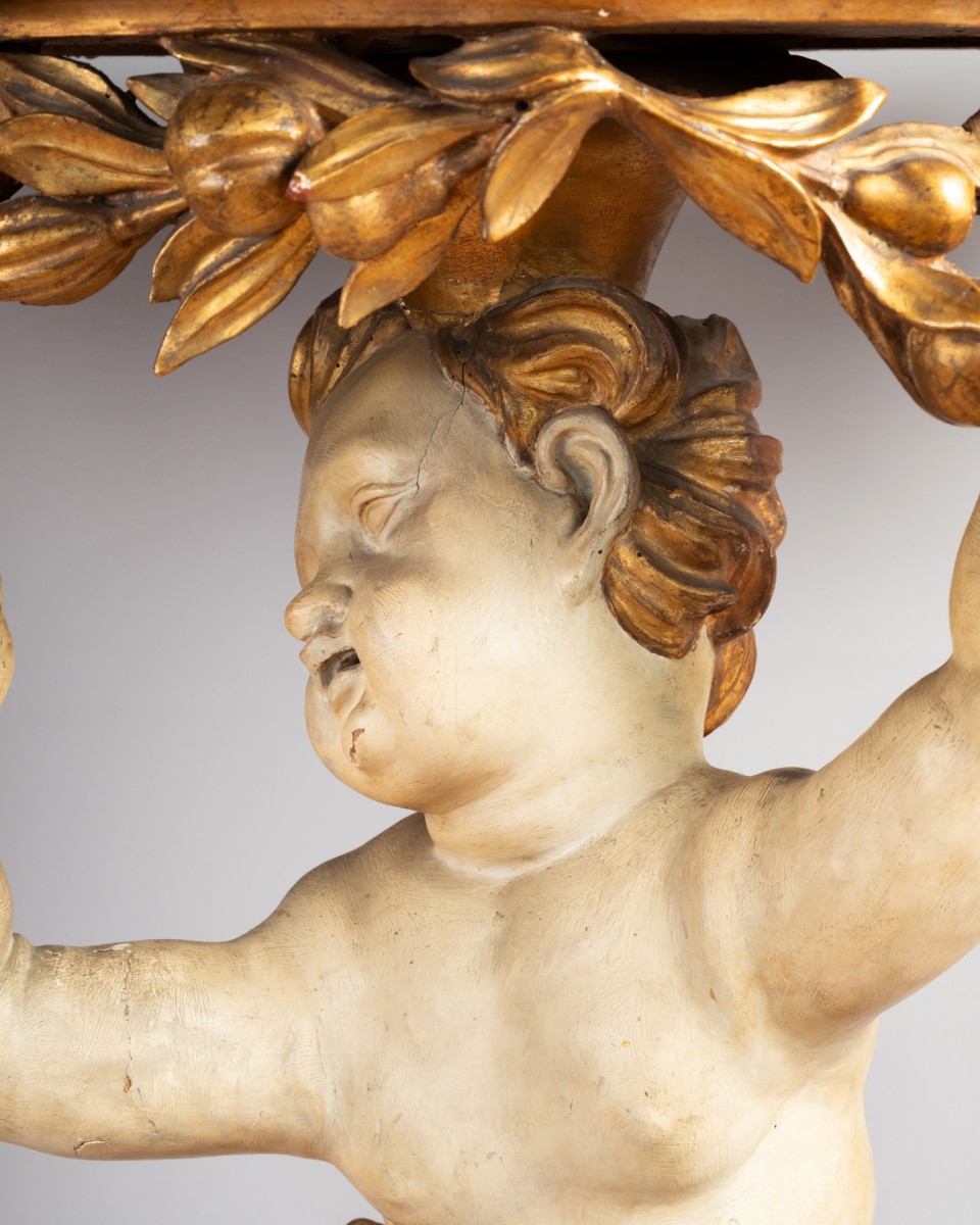 The two putti, who turn their heads in opposite directions, face each other and look at each other when the two console tables are positioned side by side, giving a pleasing symmetry to the pair.