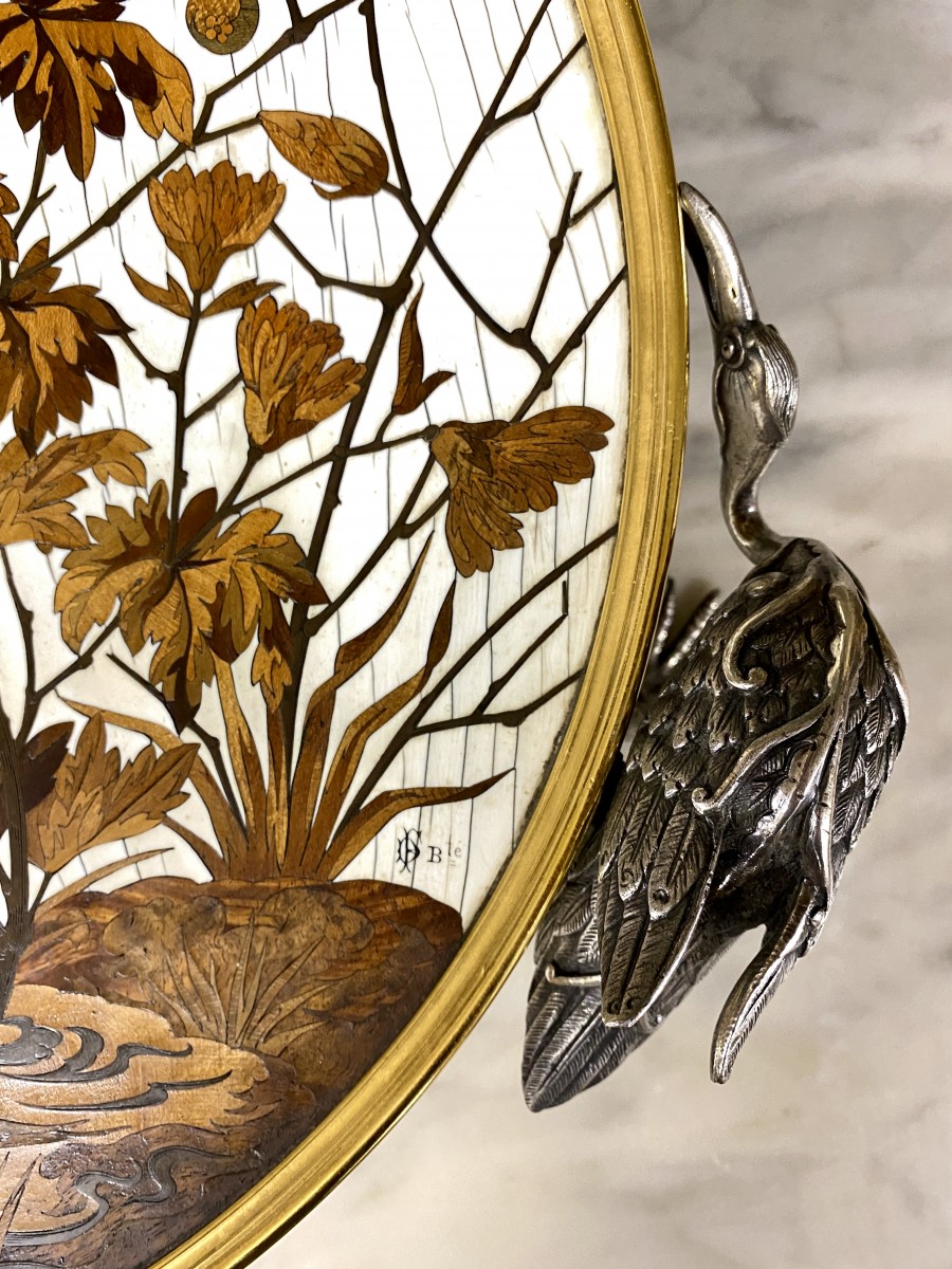 A large gilt bronze and silvered bronze bowl supported by three herons forming the base. It is decorated with a central marquetry of ivory and precious woods (rosewood, rosewood) cloisonné in chased brass. The decoration depicts a pheasant chasing a grasshopper by a pond. The decoration is signed ‘FD Bté’ for Ferdinand Duvinage Breveté. And on the rim of the cup, ‘Maison Alphone Giroux Paris’.