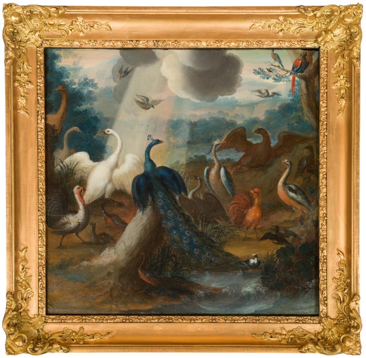 Pieter Casteels III (Antwerp, 1684–1749) was an 18th-century specialist in flower and bird paintings. In 1727 he signed a large Concert of Birds oil on canvas featuring peacocks, swans, and other exotic birds very similar to ours.