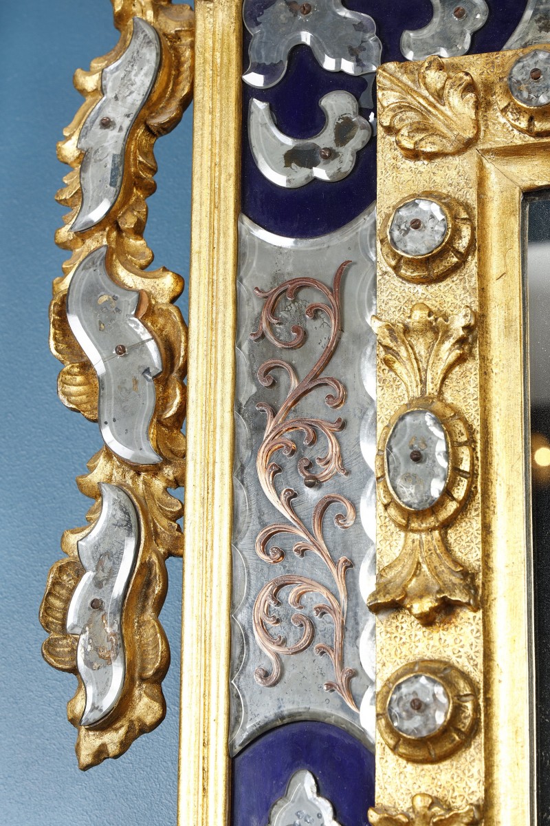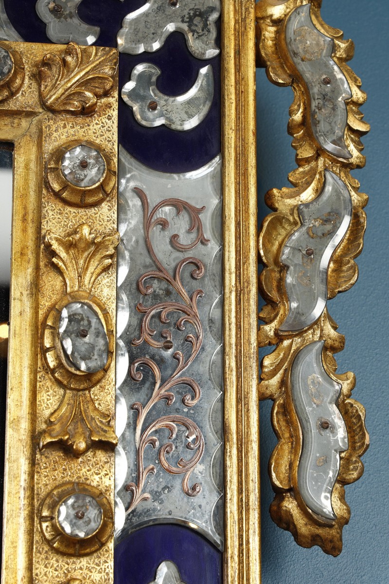 The pareclose is patterned with openwork mirrors glued on midnight blue enamel backgrounds, typical of luxury Venetian productions.