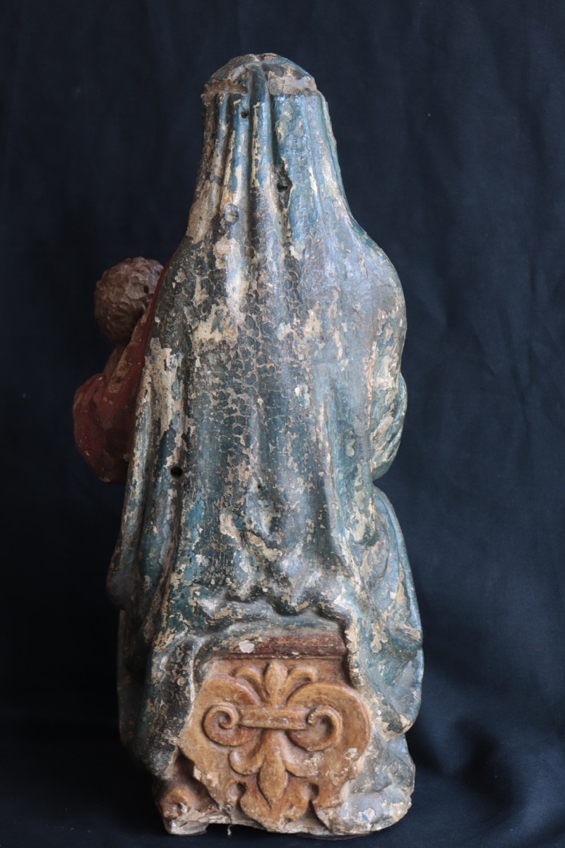 Sculpture: Madonna and Child, Siena, 15th century Polychrome stucco sculpture representing Madonna and Child seated on a throne. The sculpture has had colour consolidation work done without adding colour where there are gaps. Siena, 15th century Measurements: height 47 cm