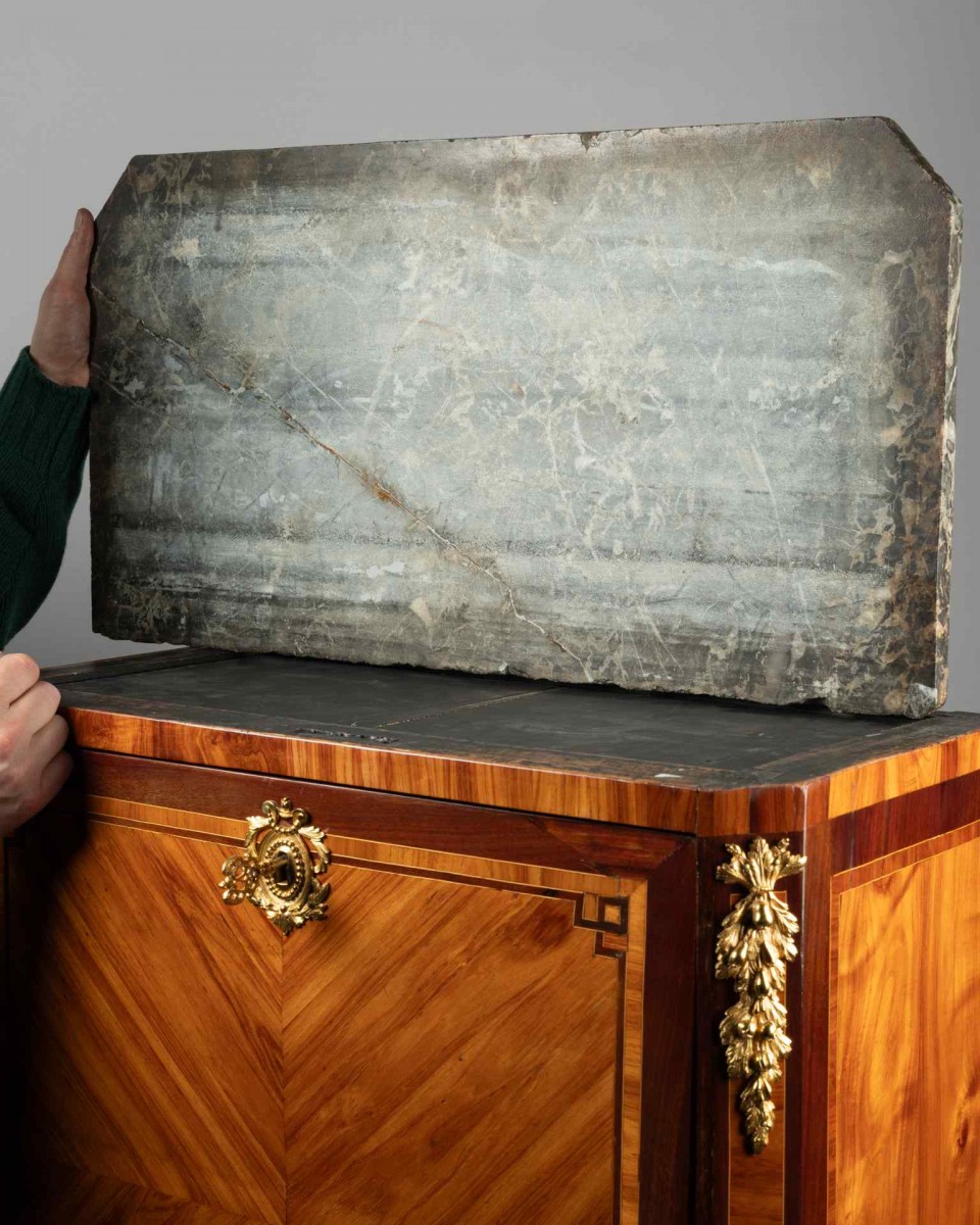 This drop-front secretary from the Louis XVI period, stamped H. Roux, is truly admirable. Crafted with rosewood and amaranth veneer on an oak carcass, it is topped with a Sainte-Anne marble slab, molded with a cavetto edge. This marble harmonizes beautifully with the finely chiseled gilt bronze mounts that adorn the corners, drops, sabots, and the lower apron of the piece. These decorative elements highlight the high-quality craftsmanship of the secretary, whose elegant proportions are also to be commended. The drop-front, covered in cognac-colored leather decorated with gold tooling, folds down to form a writing surface. Inside, the secretary features six small drawers arranged symmetrically around three open compartments above. The lower part of the piece opens with two doors adorned with herringbone veneer.The stamp H. Roux, found beneath the marble top, refers to Hubert Roux, a cabinetmaker who became a master on April 26, 1777. His workshop was located on rue Saint-Nicolas in Paris.