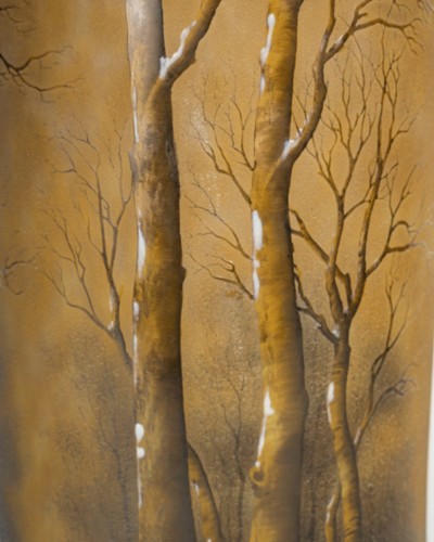 DAUM Nancy: Trees under the snow Double-layered tubular glass vase with an overflowing base. Decorated with acid-etched, hot-enamelled brown bare trees, snow-covered ground and trees painted in grisaille on a background speckled with yellow and orange powder.