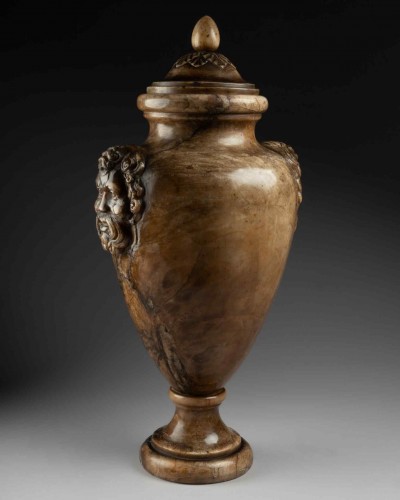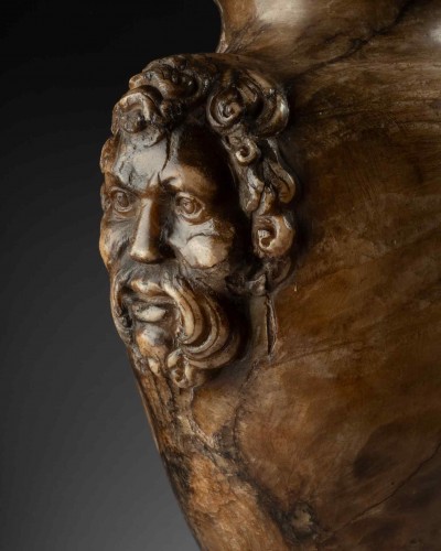 Amphora made in Rome around 1600. Carved from a warm-toned and veined fluorite, it is distinguished by its baluster-shaped silhouette resting on a curved base. Two high-relief protomes adorn the body of the amphora. They represent bearded faces inspired by mythological figures such as satyrs or rustic deities. The removable lid is topped with a sculpted ovoid knob, framed by stylized leaves.