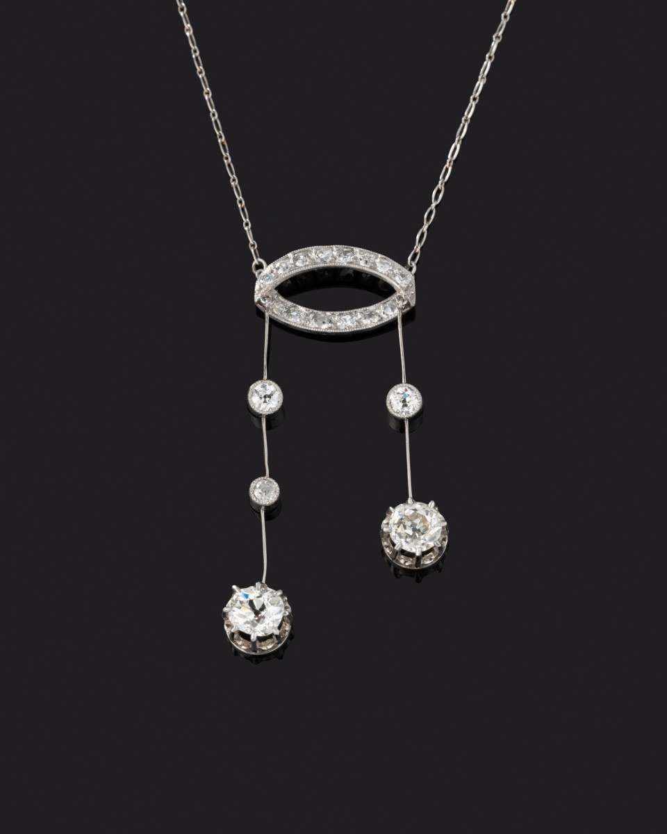 This motif holds in tassels knives set with diamonds finished with two cushion diamonds calibrating approximately 1 carat each. Neck circumference: 42.5 cm