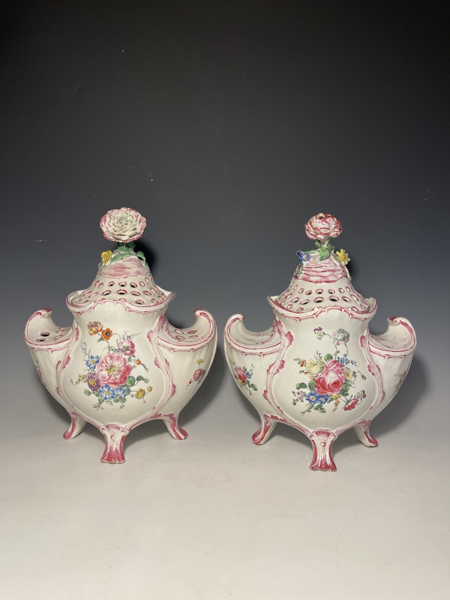 Two flower holders with openwork lids, in faience of Marseille. Polychrome decor of large bouquets of flowers. Robert's workshop. 18th century.