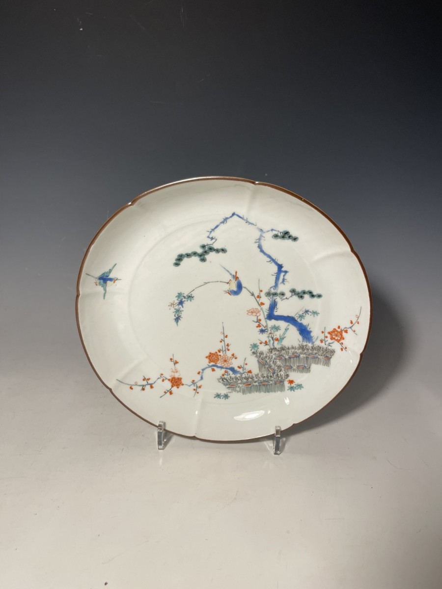 Japanese porcelain plate with Kakiemon decoration of a black hedge from which pine, bamboo and chrysanthemum branches start from branches.