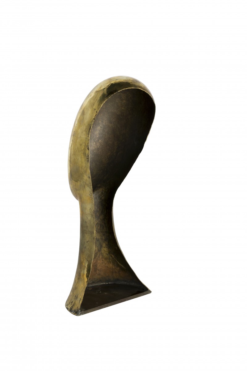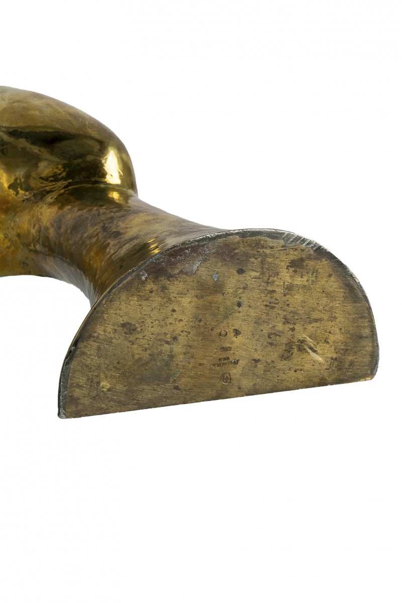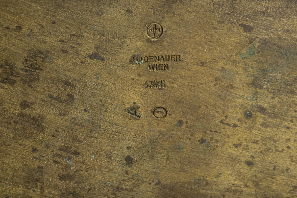 This 14.6 inches tall Hagenauer head sculpture was made from a single piece of brass and soldered onto a marked base plate. Only the best metal artists at the Werkstätte Hagenauer Vienna were capable of creating a work from a single piece of metal. The initials of the craftsman, Anton Oppawa, can be found on the plinth alongside the company markings. This was a high mark of internal recognition that was only given to objects that were considered particularly well made. The design of our head sculpture was available in different versions, for example with curls, and different sizes, whereby our very minimalist example is particularly rare.