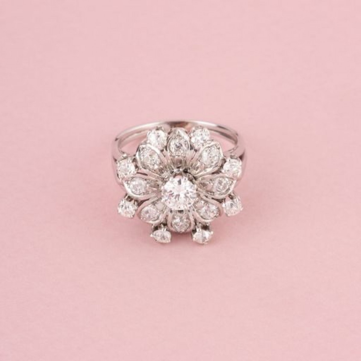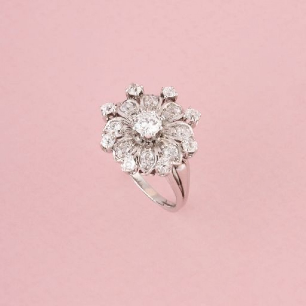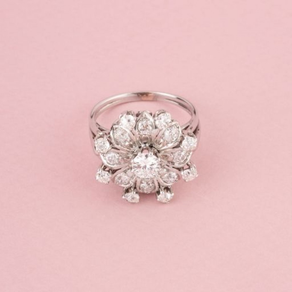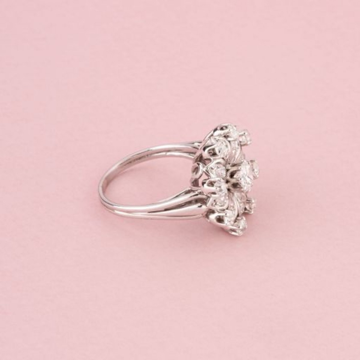 18K white gold floral ring set with a central round brilliant-cut diamond of approx. 0.45 ct (estimated F/VS), surrounded by 16 old-cut diamonds totaling approx. 1.30 ct.