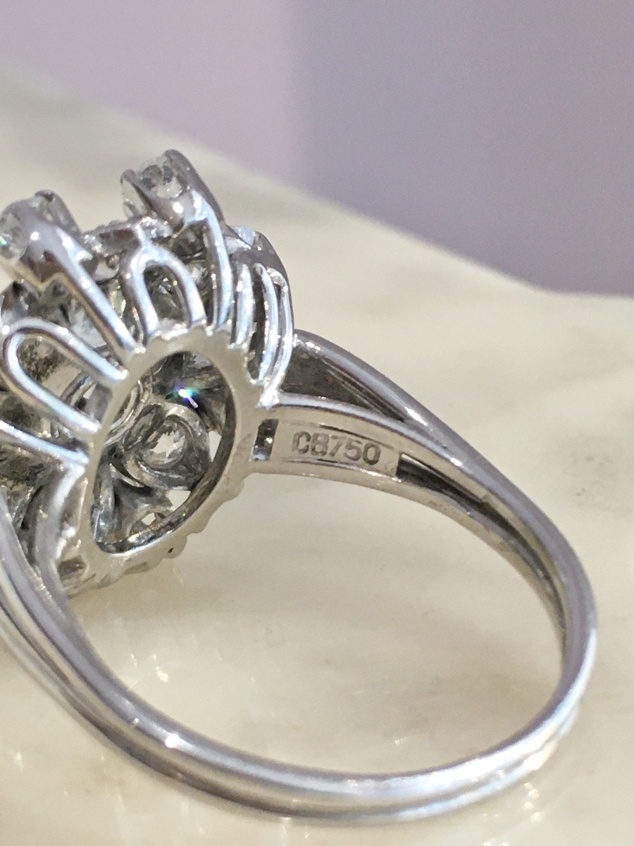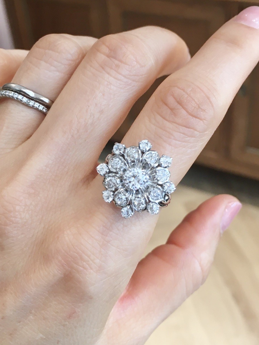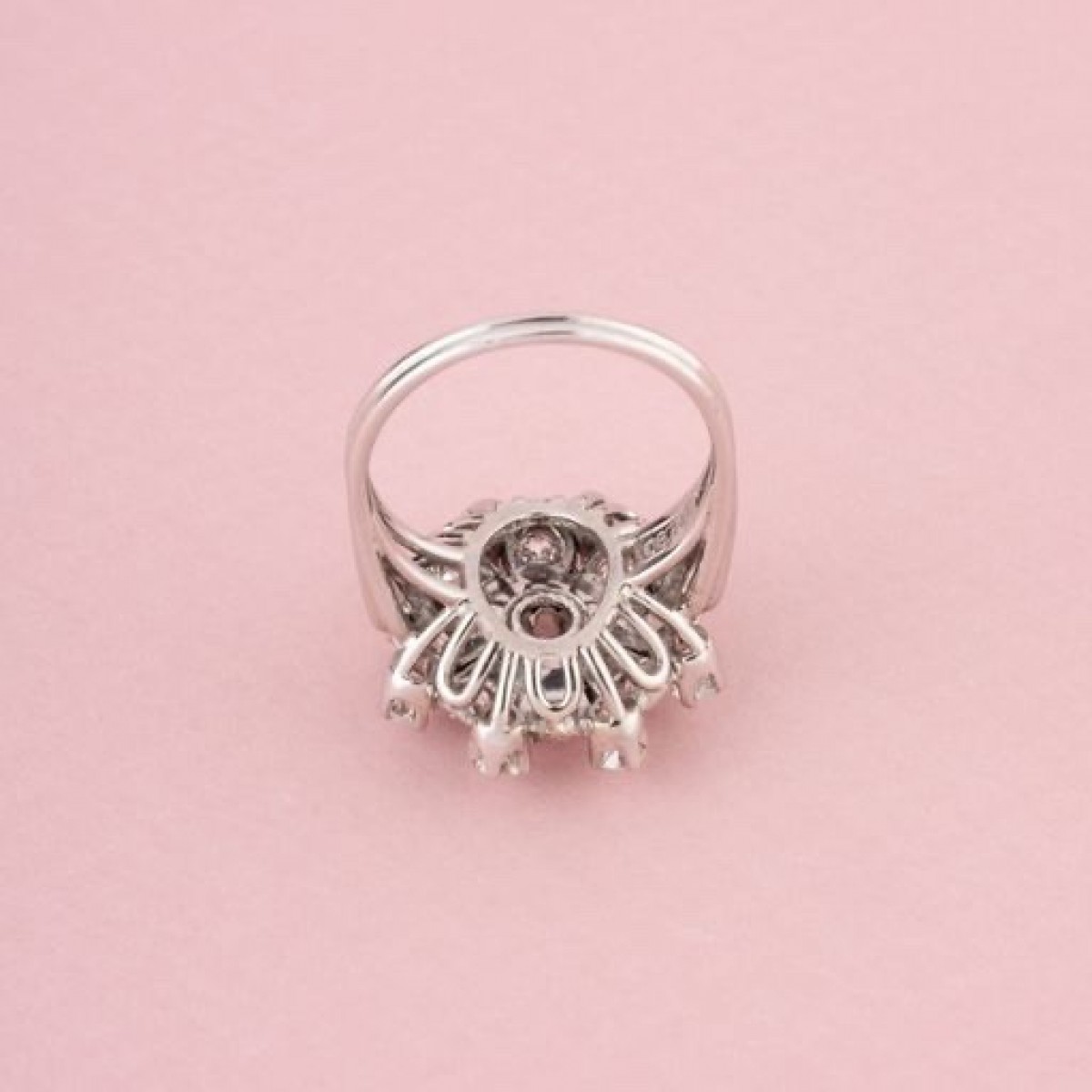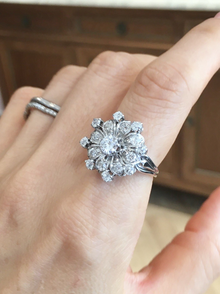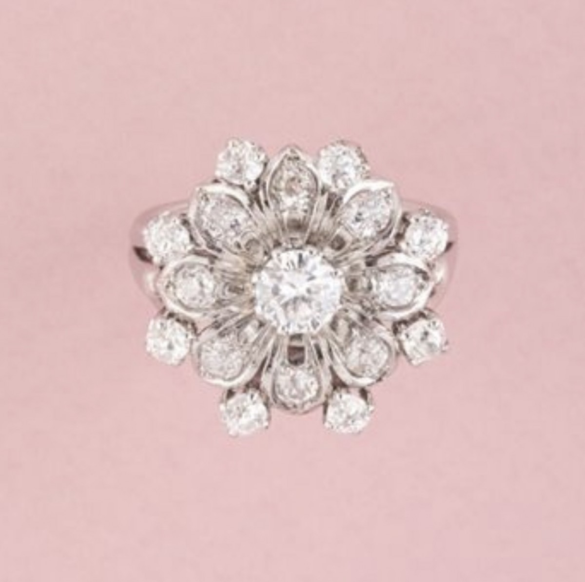 18K white gold floral ring set with a central round brilliant-cut diamond of approx. 0.45 ct (estimated F/VS), surrounded by 16 old-cut diamonds totaling approx. 1.30 ct.