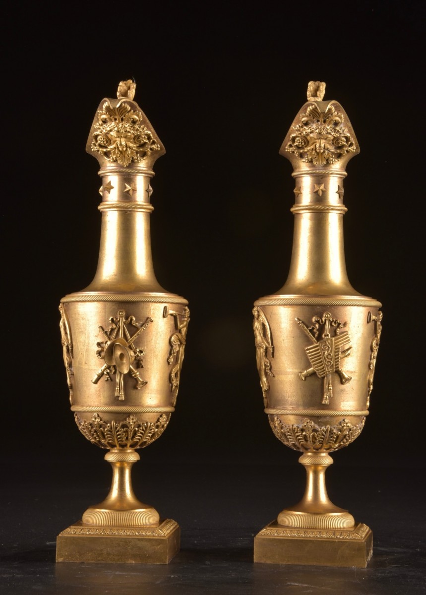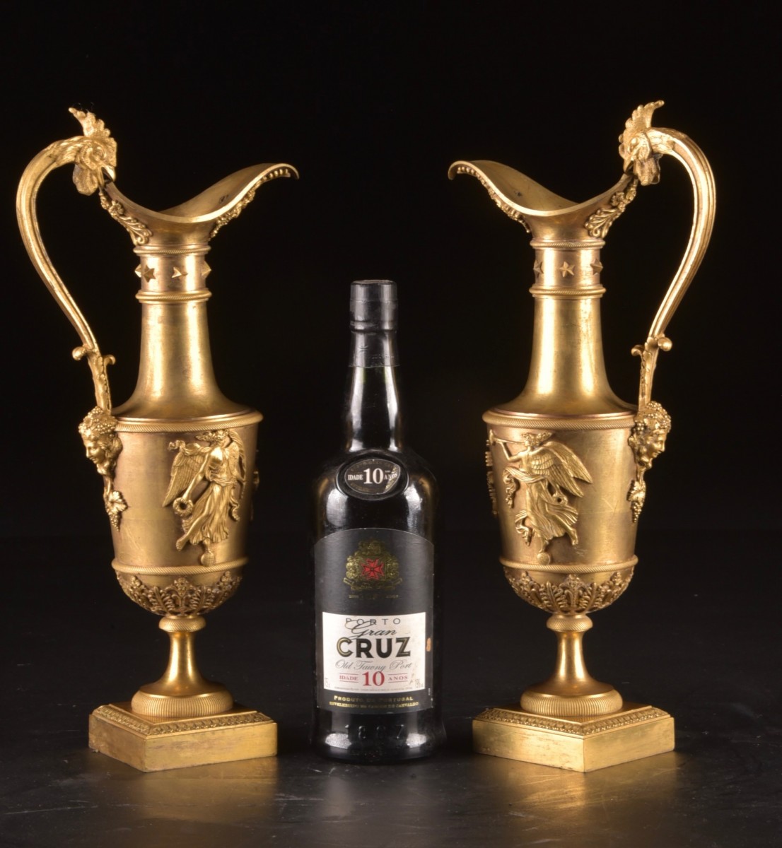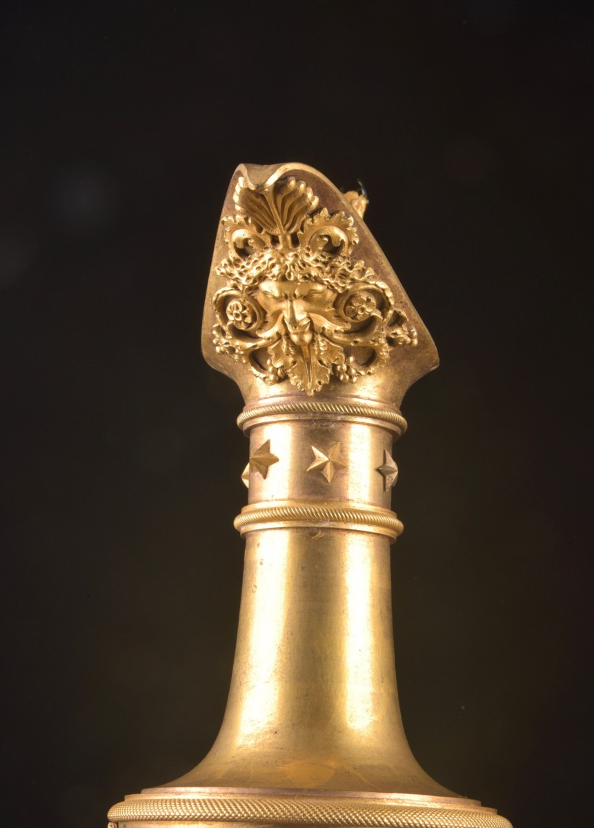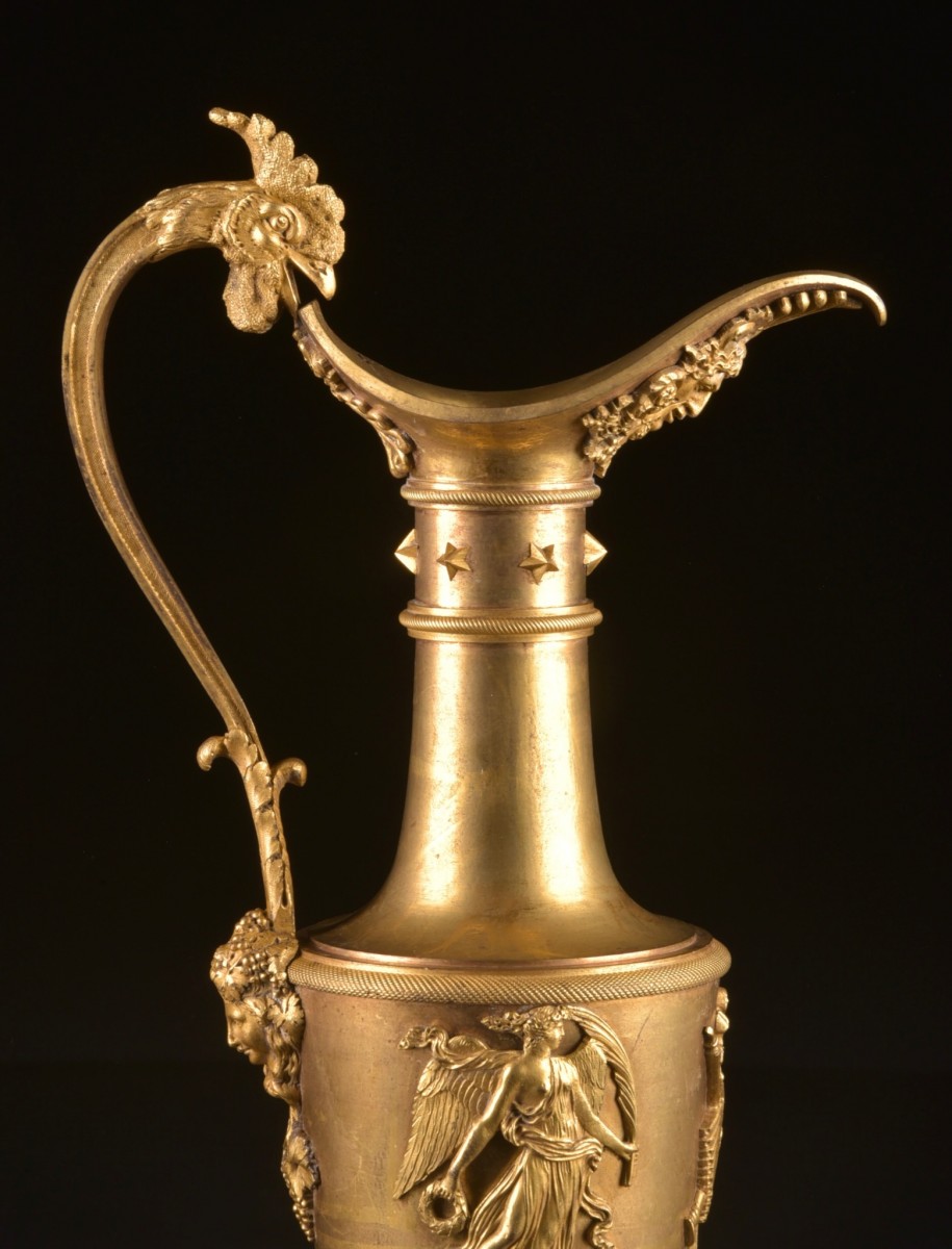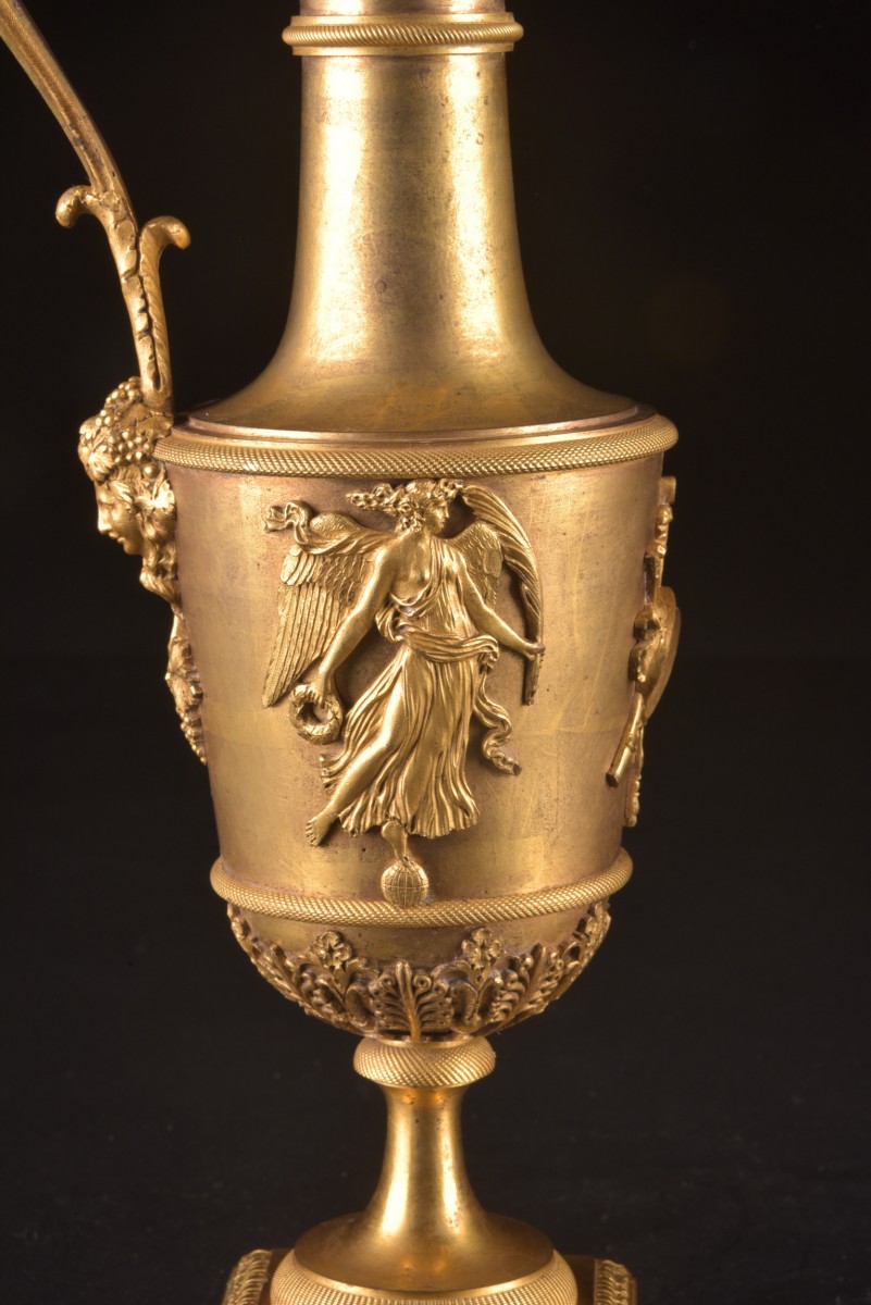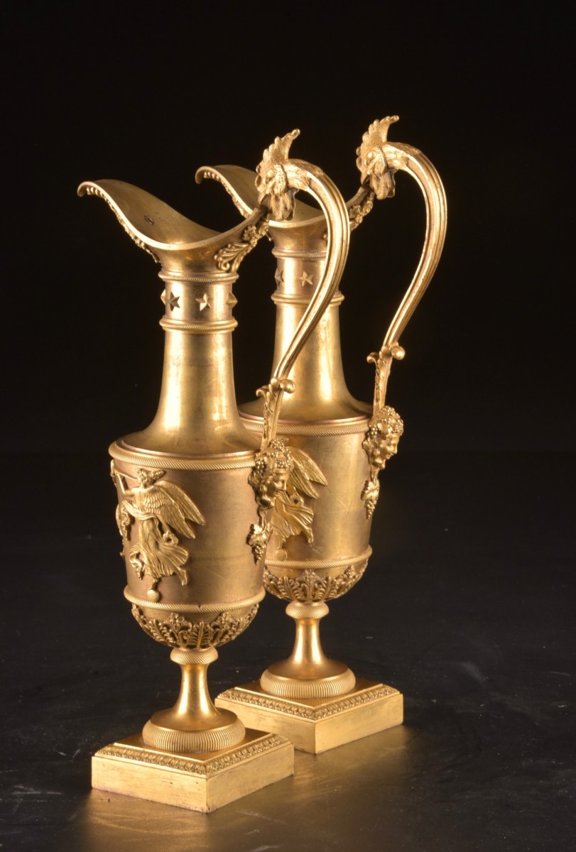 A superb pair of gilt bronze pouring vases, attributed to Claude Galle (1759–1815), one of the most renowned bronze makers of the Empire period. These elegant pieces, with refined proportions, feature richly chased handles in the form of animal heads and bodies decorated with winged figures representing Victory, holding a crown and trumpet – symbols of triumph and glory. The acanthus friezes, the stars in relief and the meticulously gilded finishes reflect the excellence of the Galle workshop, official supplier to Napoleon I. With their perfect balance between neoclassical rigor and decorative elegance, these vases embody all the grandeur of French imperial art of the early 19th century. Dimensions: 39 × 19 × 12 cm