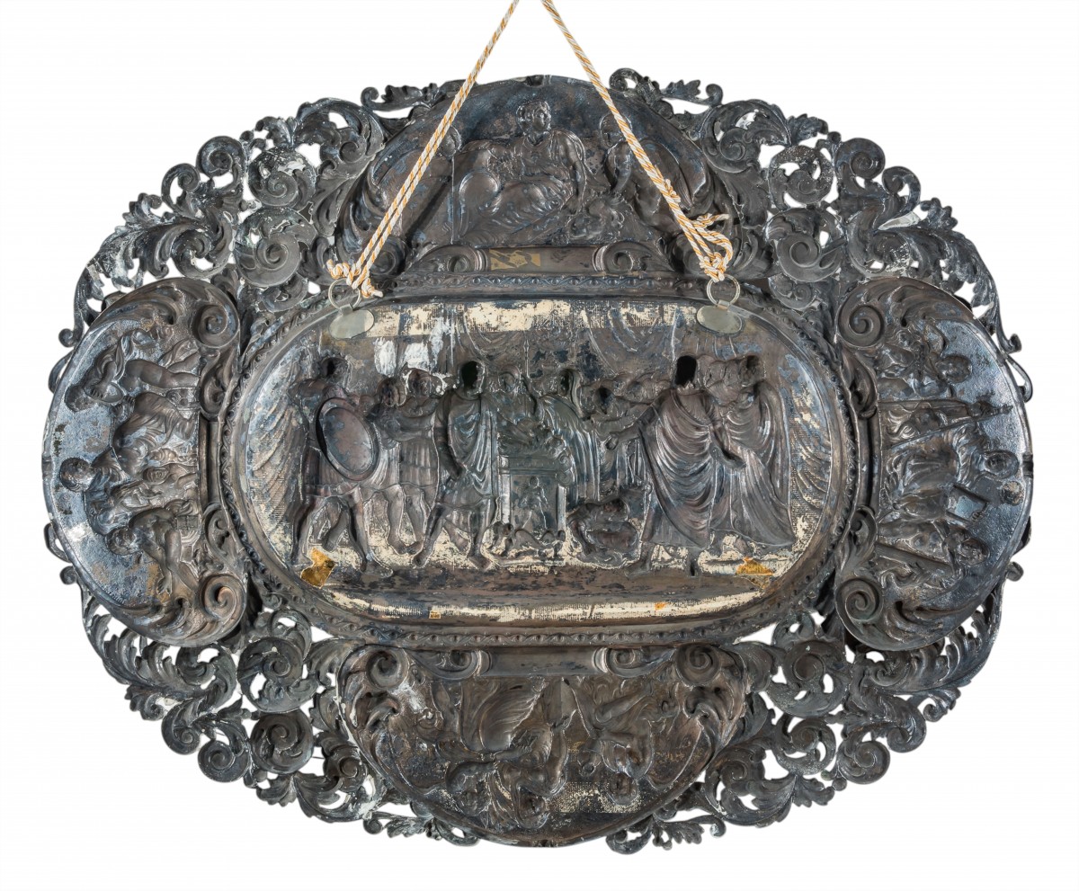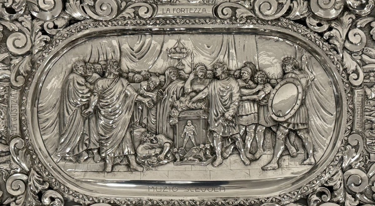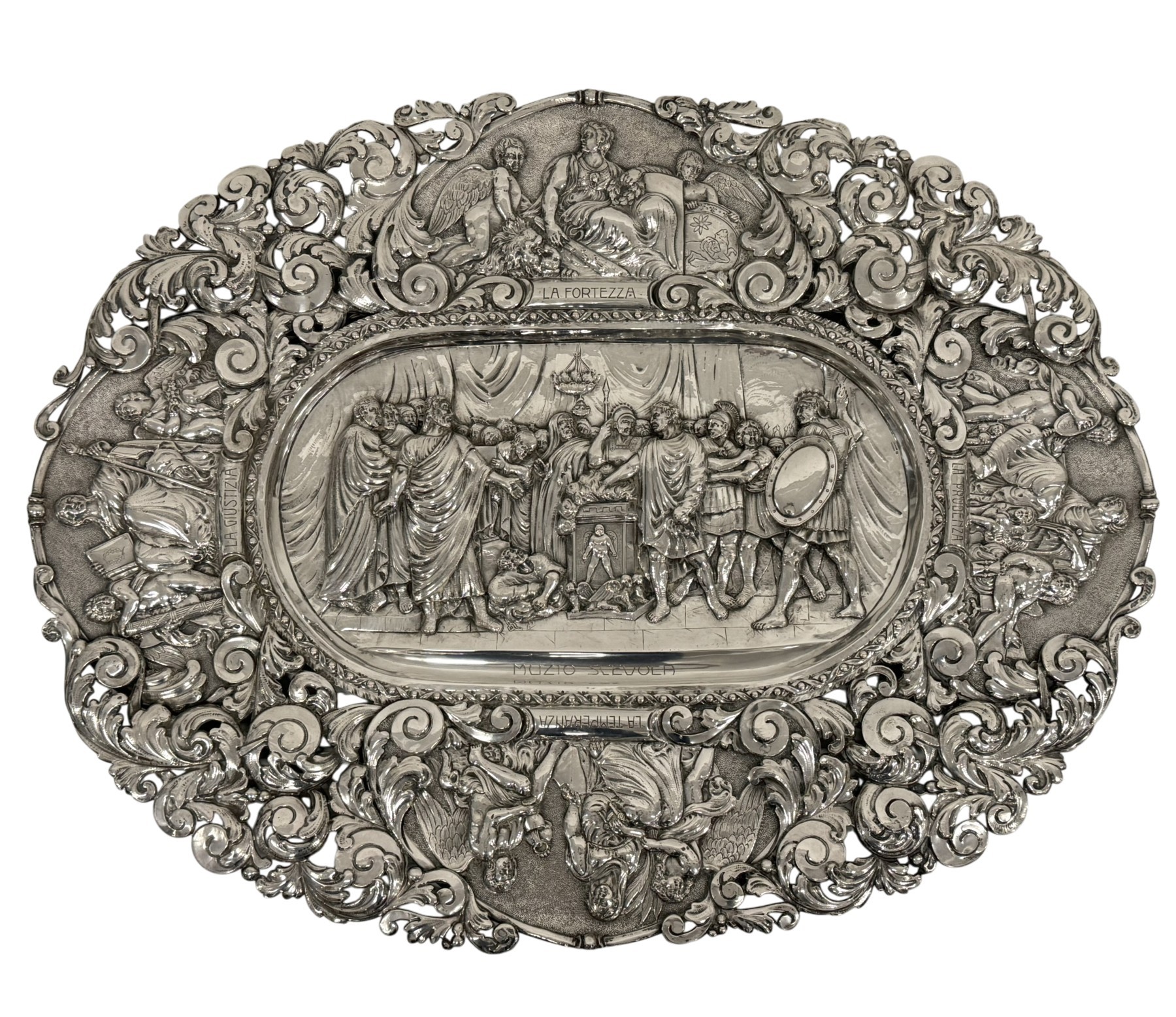 Large ceremonial platter, Milan, 20th century, in embossed silver. The central scene depicts "The Courage of Muzio Scevola" by Appiani; the rim is adorned with allegories of the four cardinal virtues, interspersed with acanthus leaf scrolls. 78 x 100 cm; 5250 g; hallmark: Speronari 3 Milan and fineness 800.