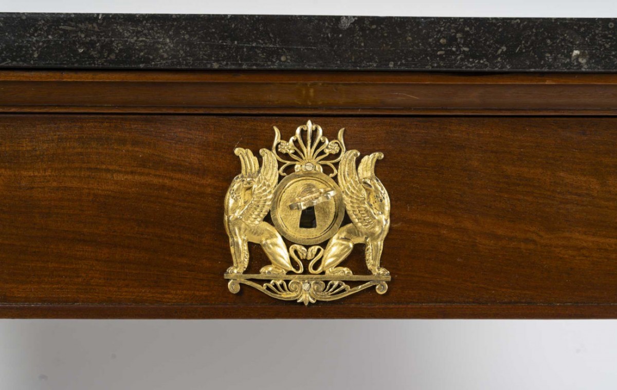Small console table in solid mahogany and mahogany veneer, rectangular in shape, opening with a drawer on the front, from the 1st Empire period (1804-18015), 19th century.