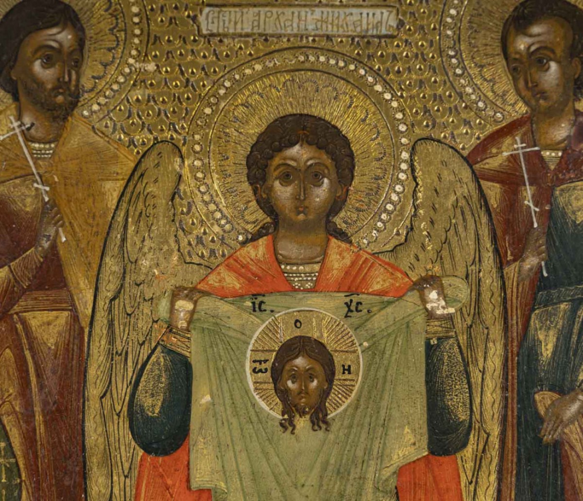 The recognizable Archangel Michael in the center is surrounded by four saints in the background and holds in his hands the mandylion on which the face of Christ can be seen.