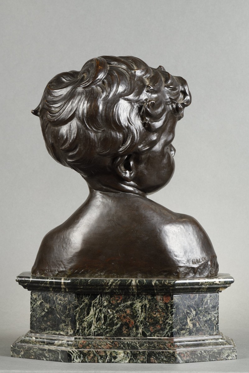 Our bronze example, cast by Hébrard and set on a veined marble base, belongs to this lineage while offering a different reading: the brown patina enhances the play of light on the face and lends the sculpture a particular emotional depth.