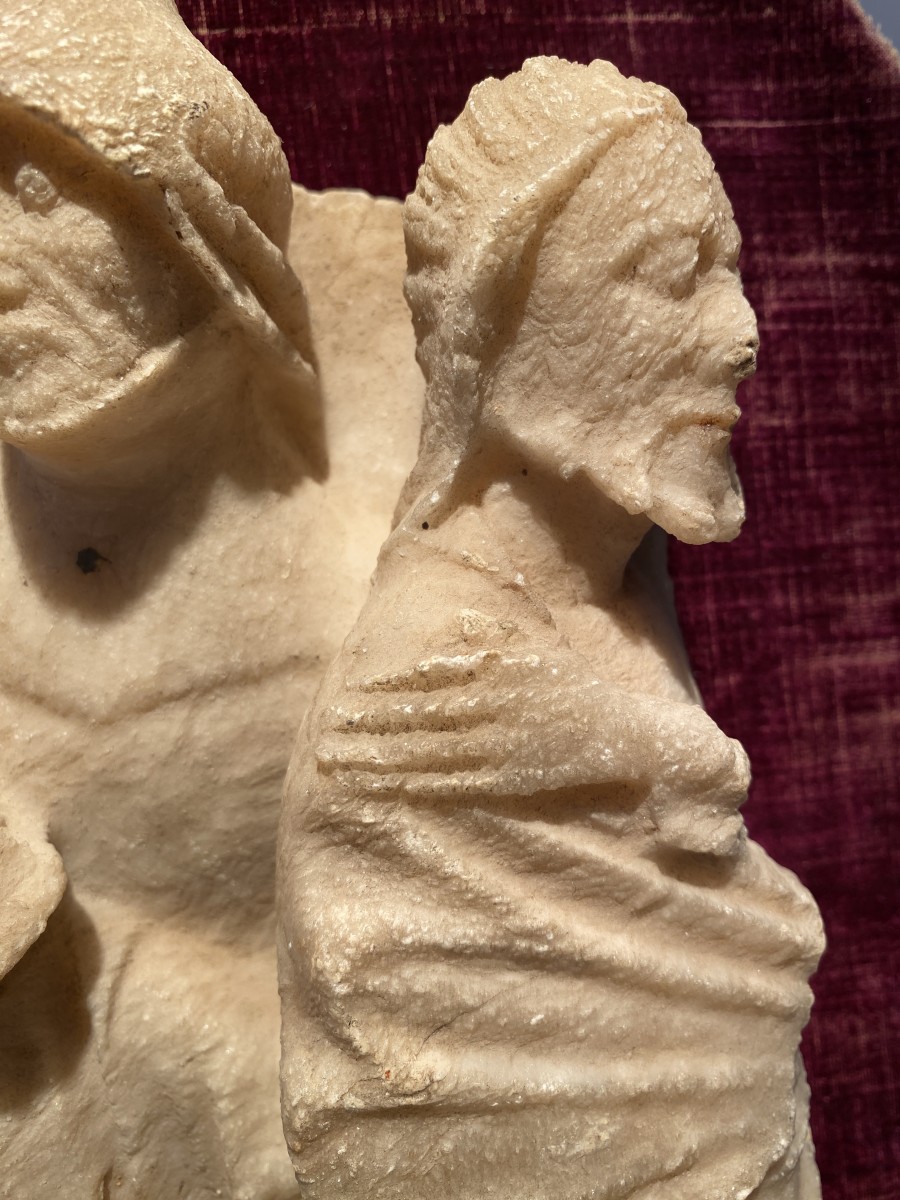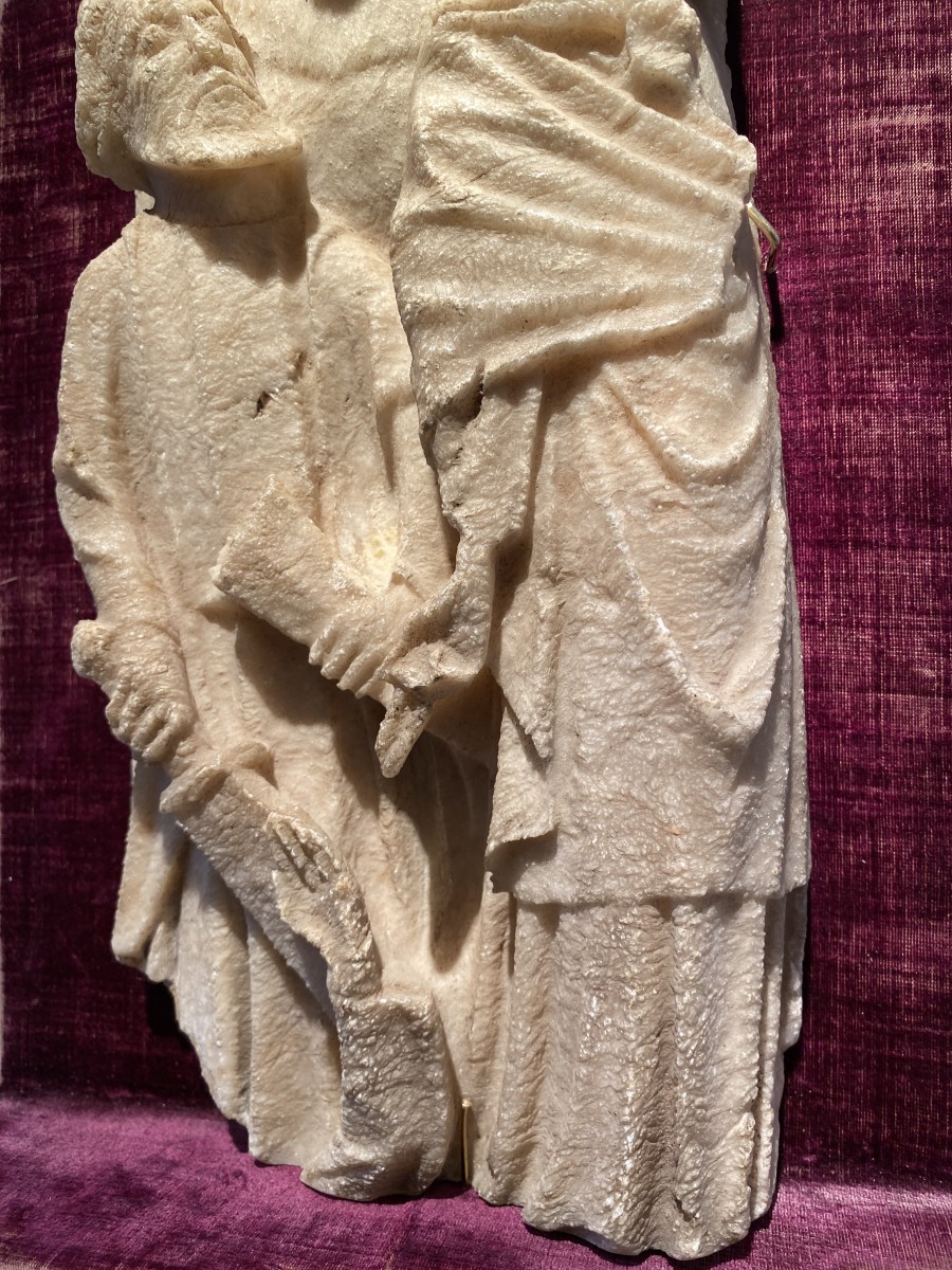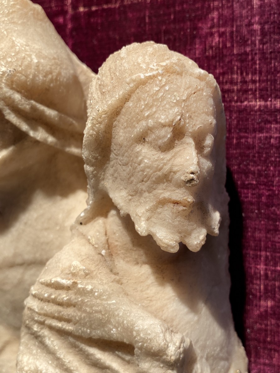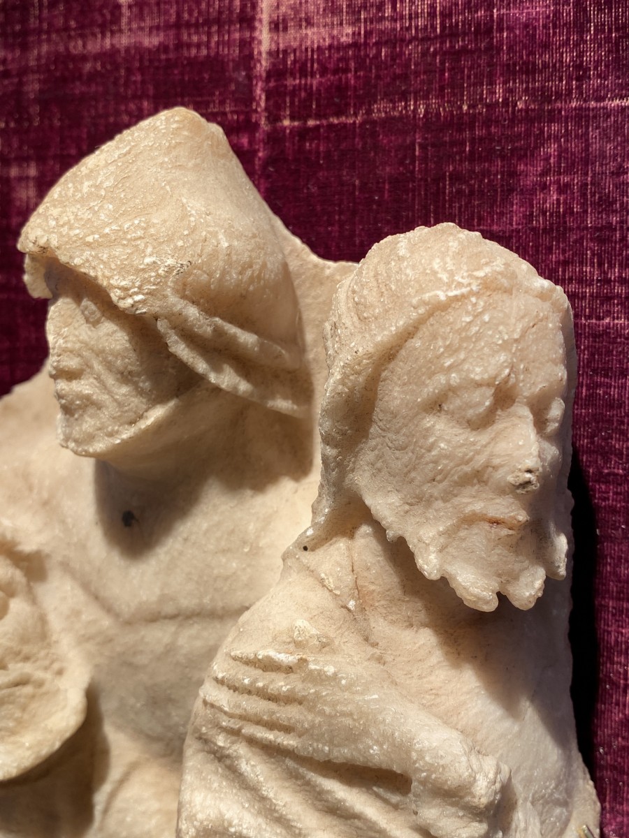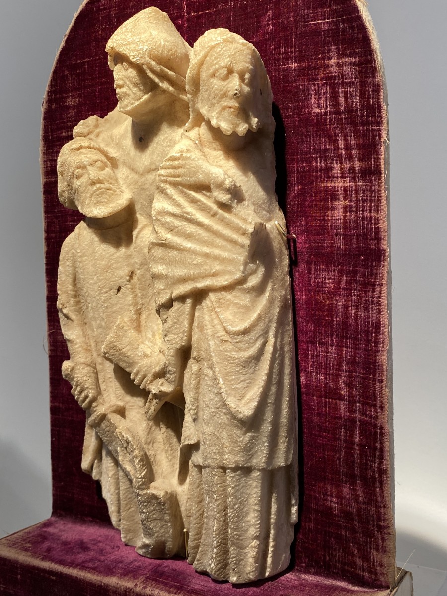 A large fragment of the betrayal of Christ by Judas (or ‘The Kiss of Judas’) in Nottingham alabaster (15th century). On the right we see Christ holding his cheek towards Judas while the hand of the latter rests on Christ’s right shoulder. In the middle, a roman soldier is looking down upon Saint Peter, who holds his sword in the right hand and sheath in the left. With this sword Peter has just cut off the right ear of Malchus, servant of high priest Caiaphas, in charge of the arrest of Christ. Malchus would be lying down on the ground, underneath Peter and Christ, wriggling with pain. We can still see his arm reaching upwards towards the hand of Jesus, who will perform His last miracle before His crucifixion by re-attaching the ear back to the head of Malchus. We can see that Jesus casually holds Malchus’ ear in His right hand and gives it back to him. Judas – surrounded by roman soldiers - would have been standing next to Jesus, giving Him the kiss of betrayal (the one kissed by Judas was for Malchus the sign for the one to be arrested). Weathered, chips to the noses. Excellent condition (unbroken). The lips of Jesus have minimal remains of original red polychromy. On a faded velvet stand.