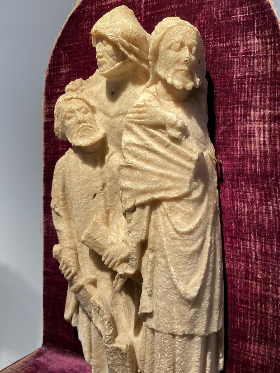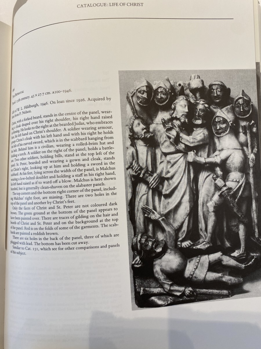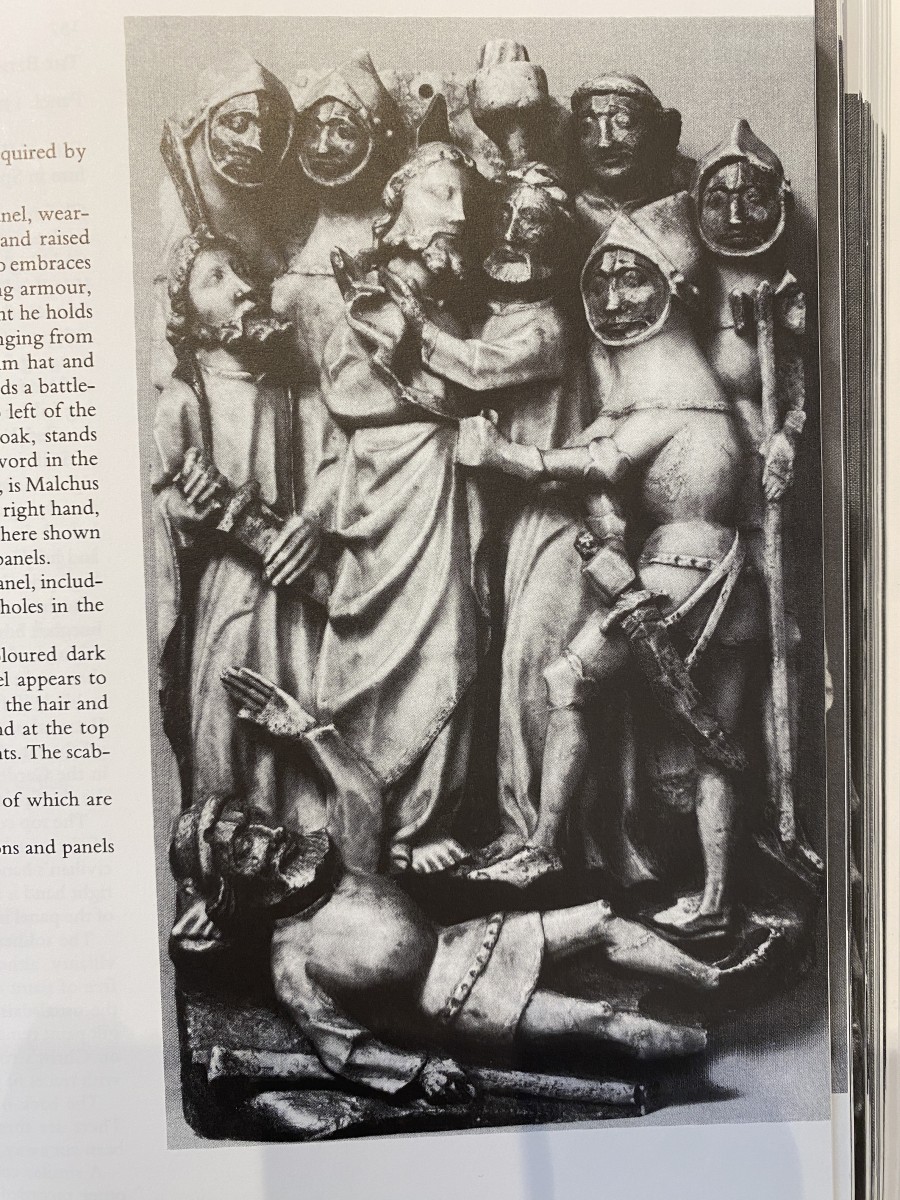 Bibliography: in his book ‘English Medieval Alabasters’ Francis Cheetham gives some examples of Betrayal scenes in the Victoria & Albert Museum (illustrations 151-158 on p224-231). The one depicted on p.229 (ill.156) is the one closest to our fragment