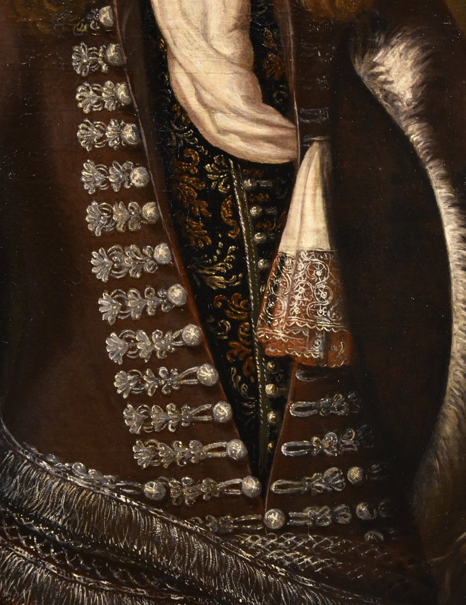 The artist's great skill is evident in the rendering of his clothing: a dark coat, probably velvet or damask, richly decorated with embroidery and shiny buttons on the front and sleeves, with white lace cuffs.