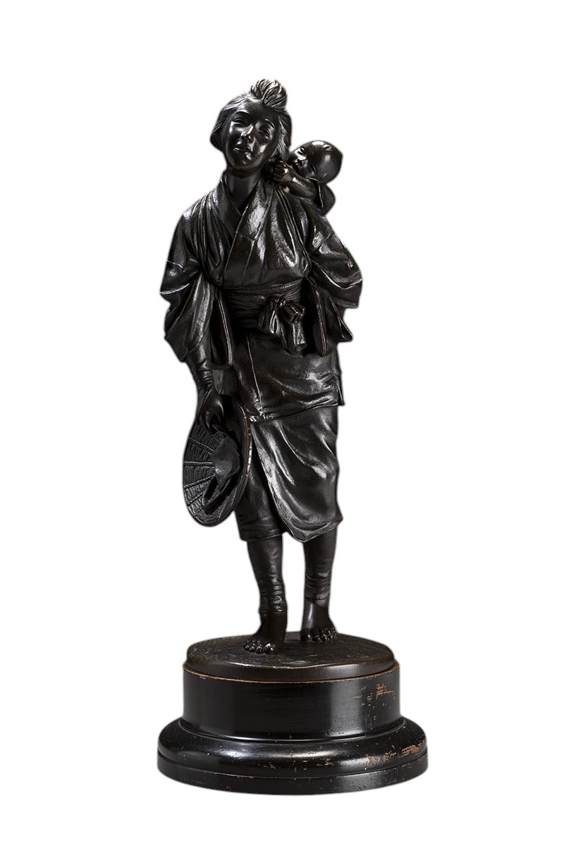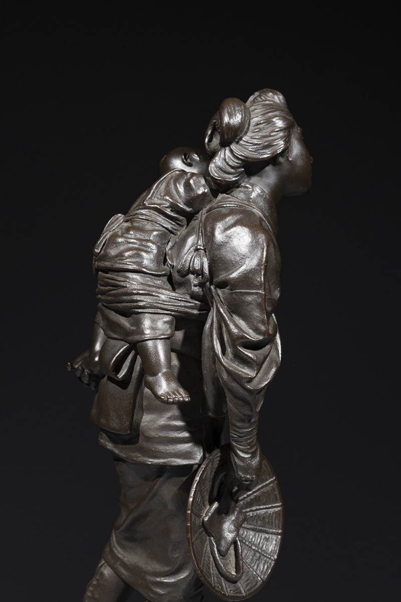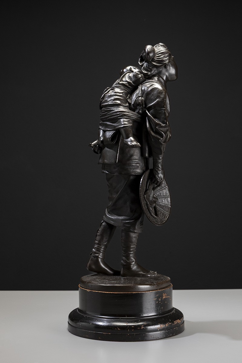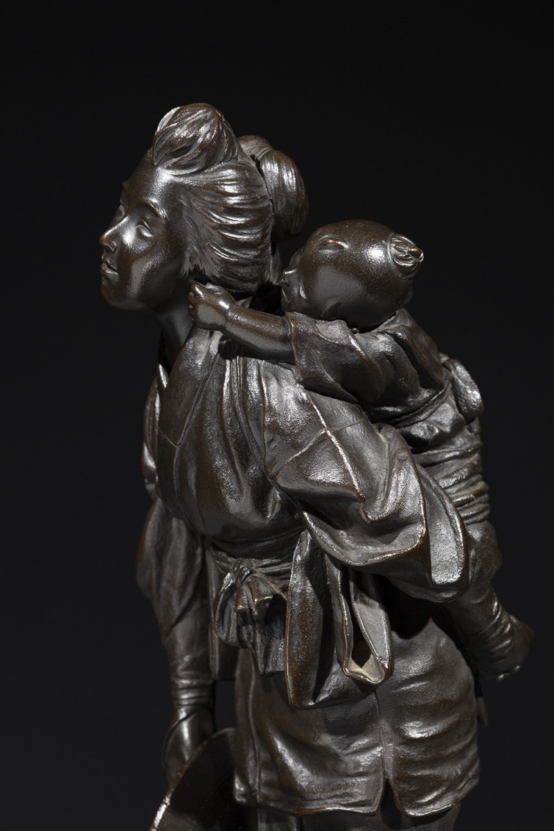 A Japanese bronze sculpture of the Tokyo School, depicting a young mother walking with her child tied to her back.