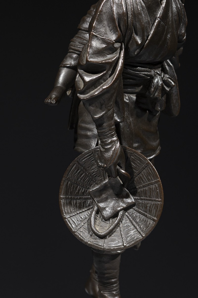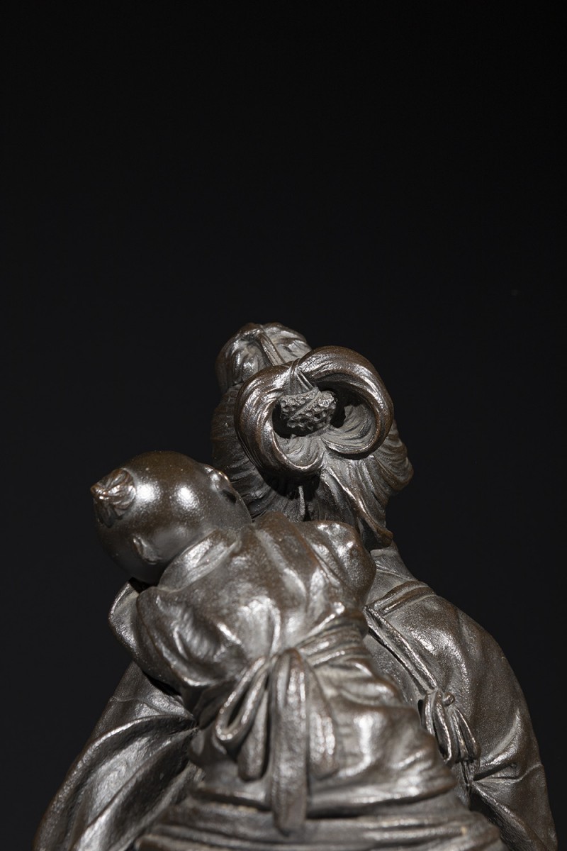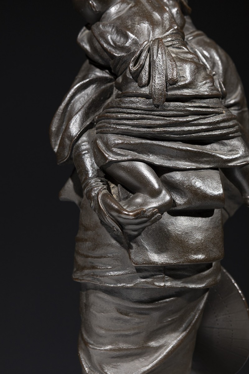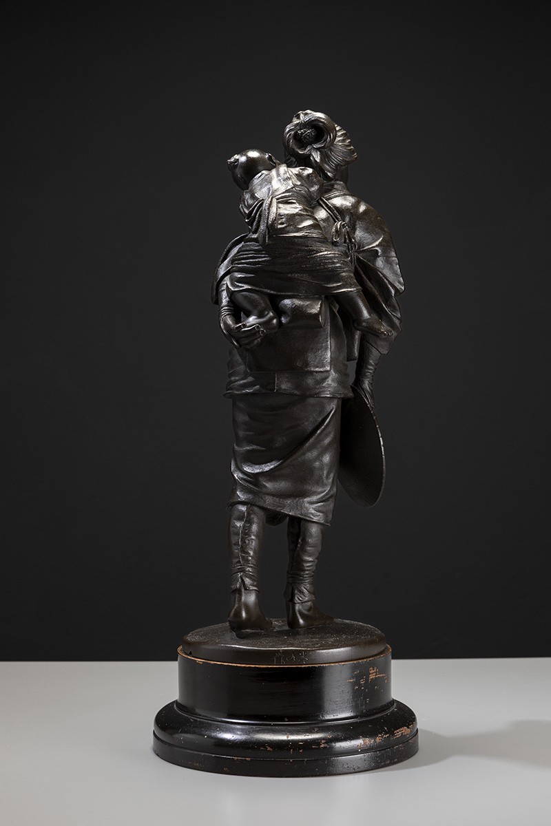 A Japanese bronze sculpture of the Tokyo School, depicting a young mother walking with her child tied to her back.