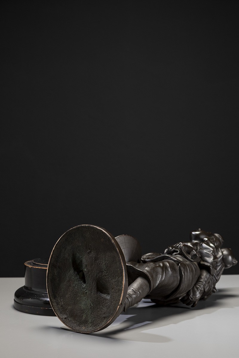 The sculpture is signed along the edge and rests on a circular base in black lacquered wood.