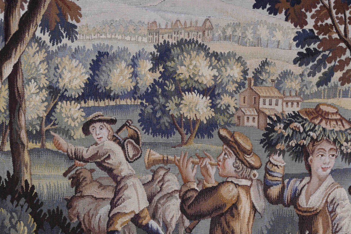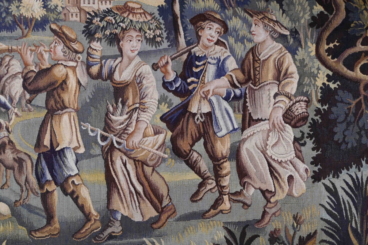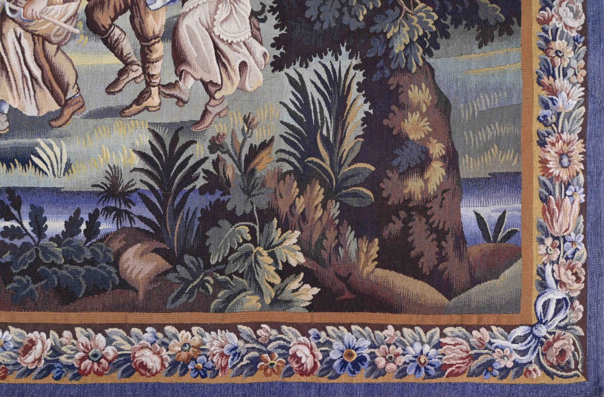 This tapestry depicts a moment of village rejoicing in a bucolic setting, with rich floral decoration and typically French elegance, faithful to the Aubusson tradition of the 19th century.