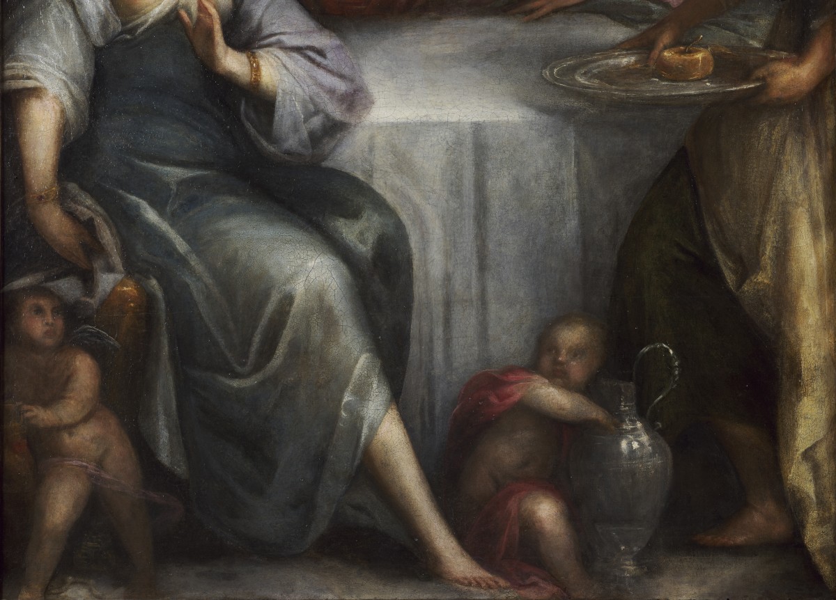 This previously unpublished painting depicts three female figures seated around an oval table, easily identifiable by their attributes: Hera in the center (peacock), Athena on the right (helmet and spear), and Aphrodite on the left (a small winged Cupid at her feet). Standing next to the table, a woman carries a golden apple on a silver tray. In the upper left background, a male figure seen from behind, perhaps a servant, is lifting a red curtain, revealing the classical architectural elements that characterize the background. In the lower foreground, a seated cherub embraces a large silver amphora.