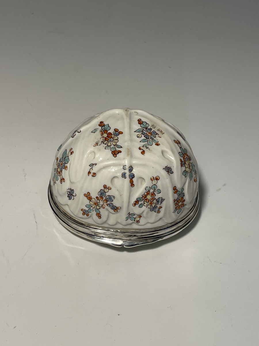Chantilly porcelain snuff box, decorated with embossed leaves and little flowers in the Kakiemon style. Silver mounts. 18th century.