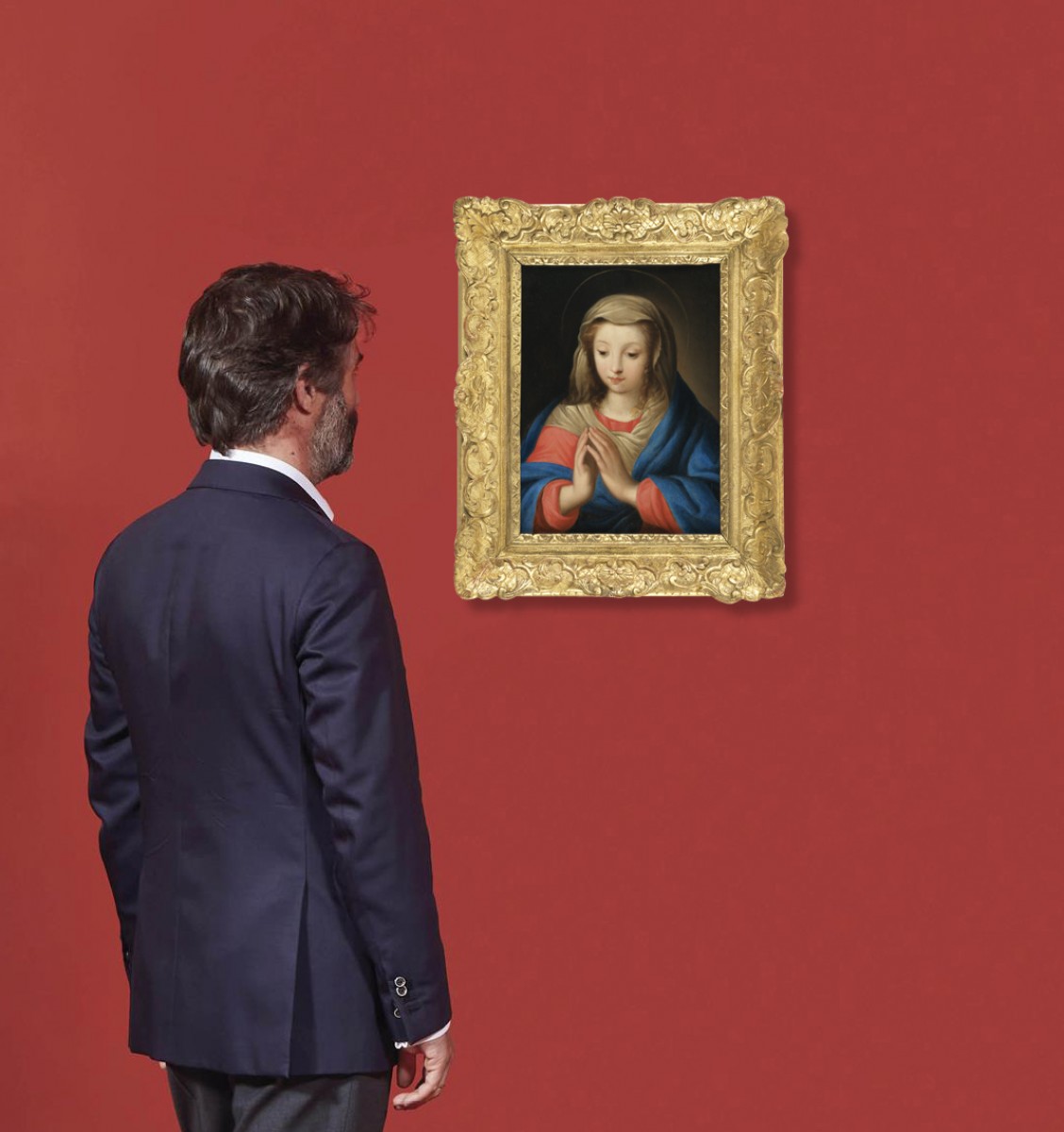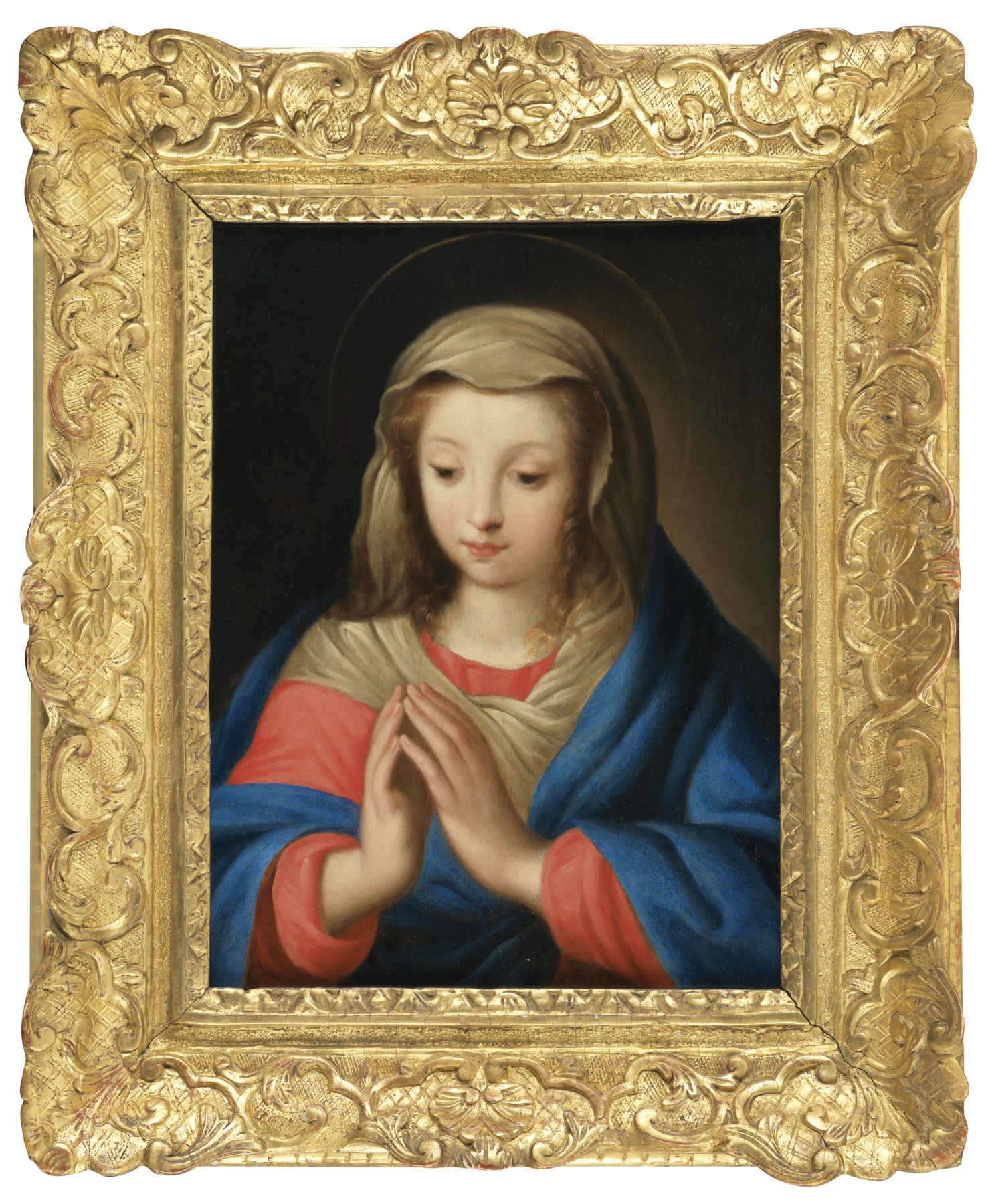 Our composition is based on the very famous Virgin in Prayer by Giovanni Battista Salvi, known as Sassoferrato (Sassoferrato 1609 – Rome 1685), of which many versions are known, notably the one preserved in the National Gallery in London, which presents a framing similar to ours.