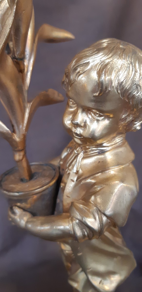 A little girl and a little boy each holding a flower pot with two blossoms.