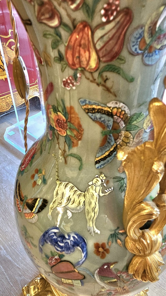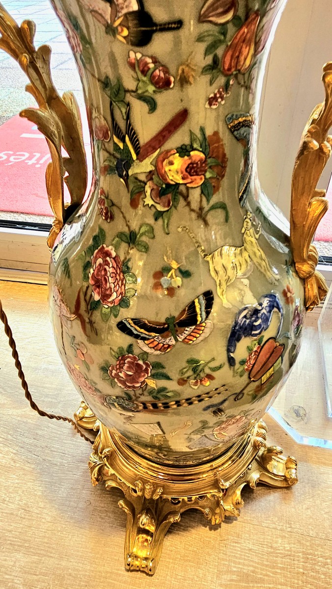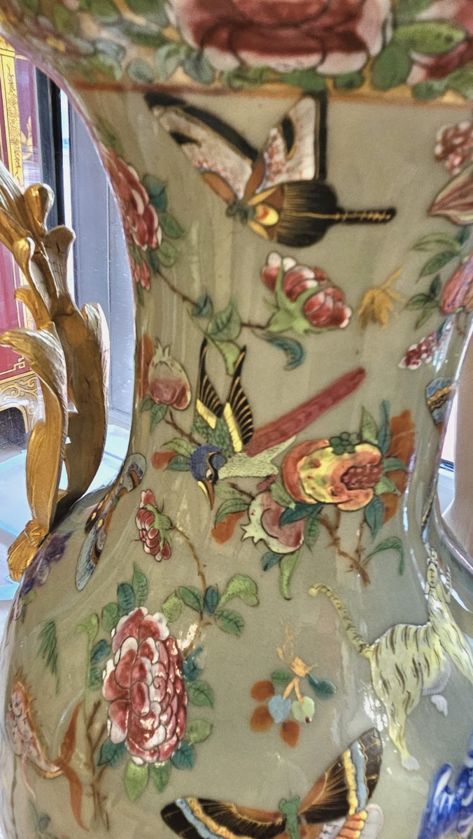 The neck of the vase continues this refined decorative vocabulary, animated by polychrome butterflies and blooming flowers, reinforcing the prosperous and sumptuous character of the piece.