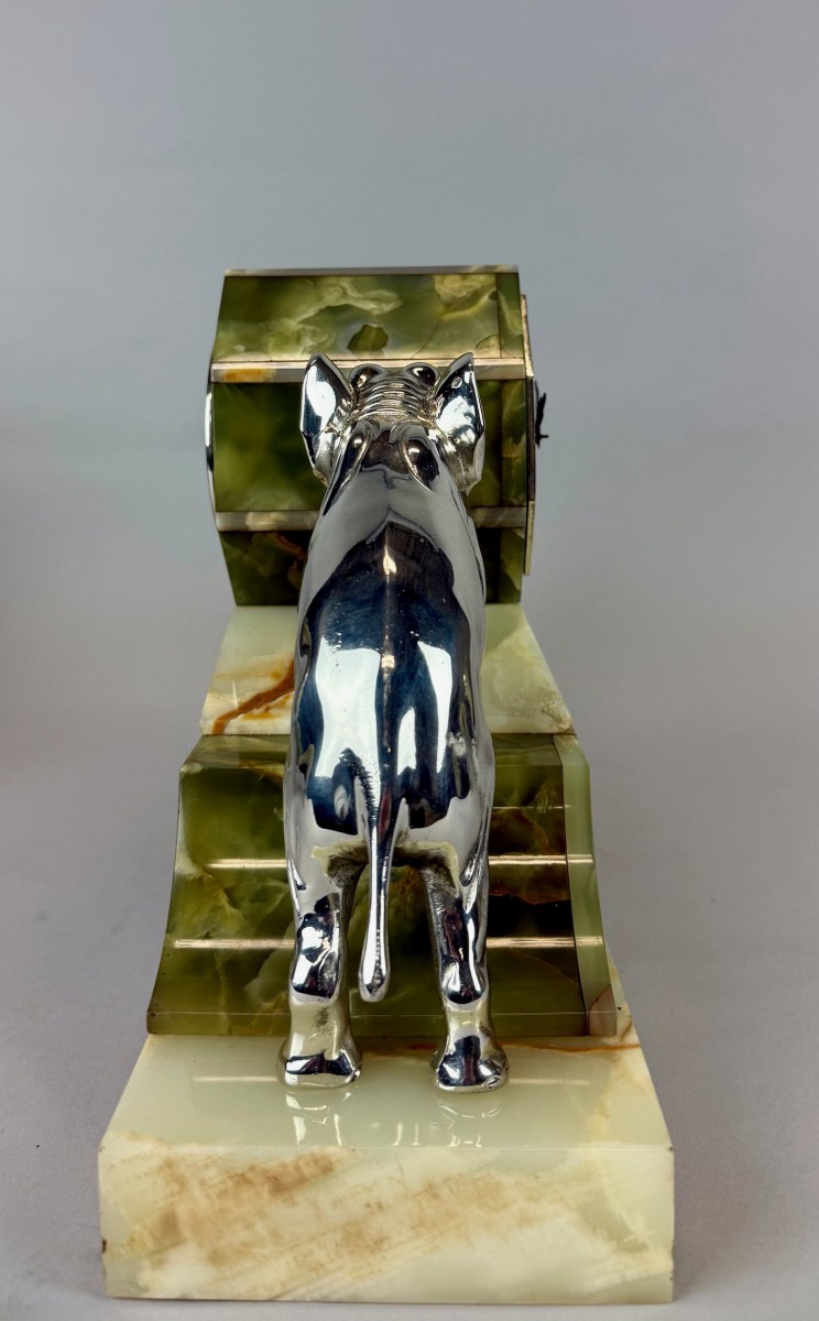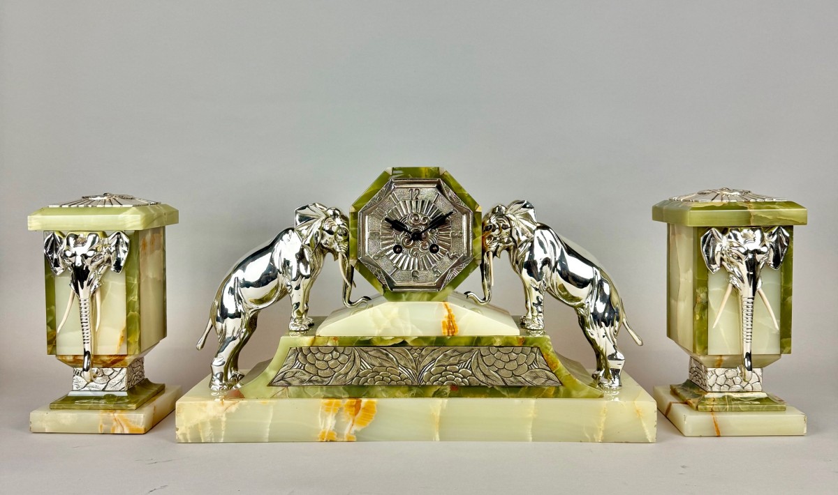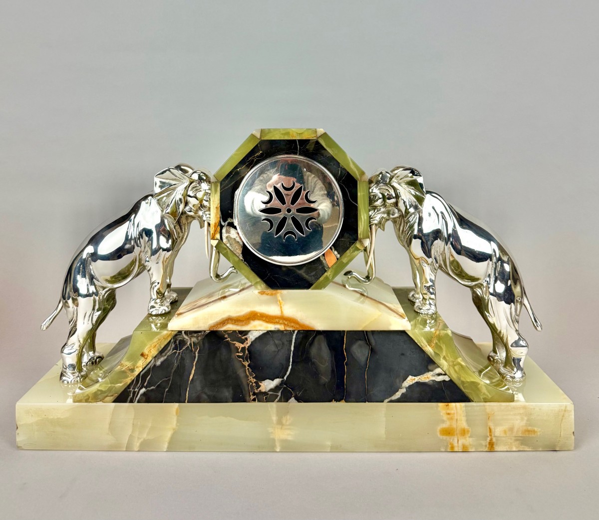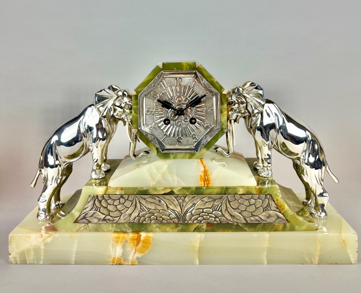 French Art Deco Onyx & silver plated Elephant Clock Garniture by Japy Frères, circa 1930
