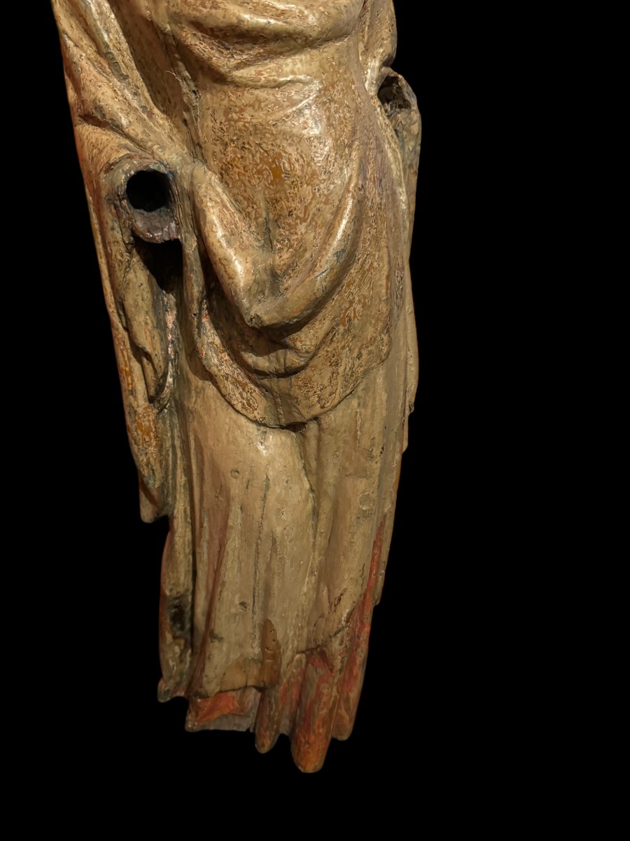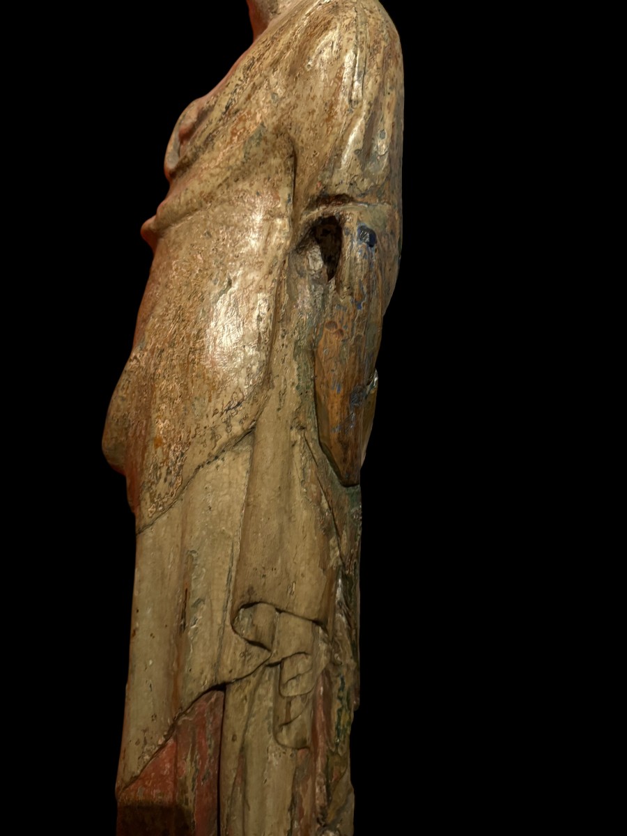 The attributes are missing, but the elegant posture and expression could be those of Mary Magdalene. The bottom of the statue is missing, probably due to damage from that period (moisture, fire?). The overpainting was removed down to the remains of the original polychromy.