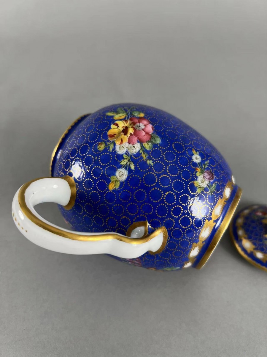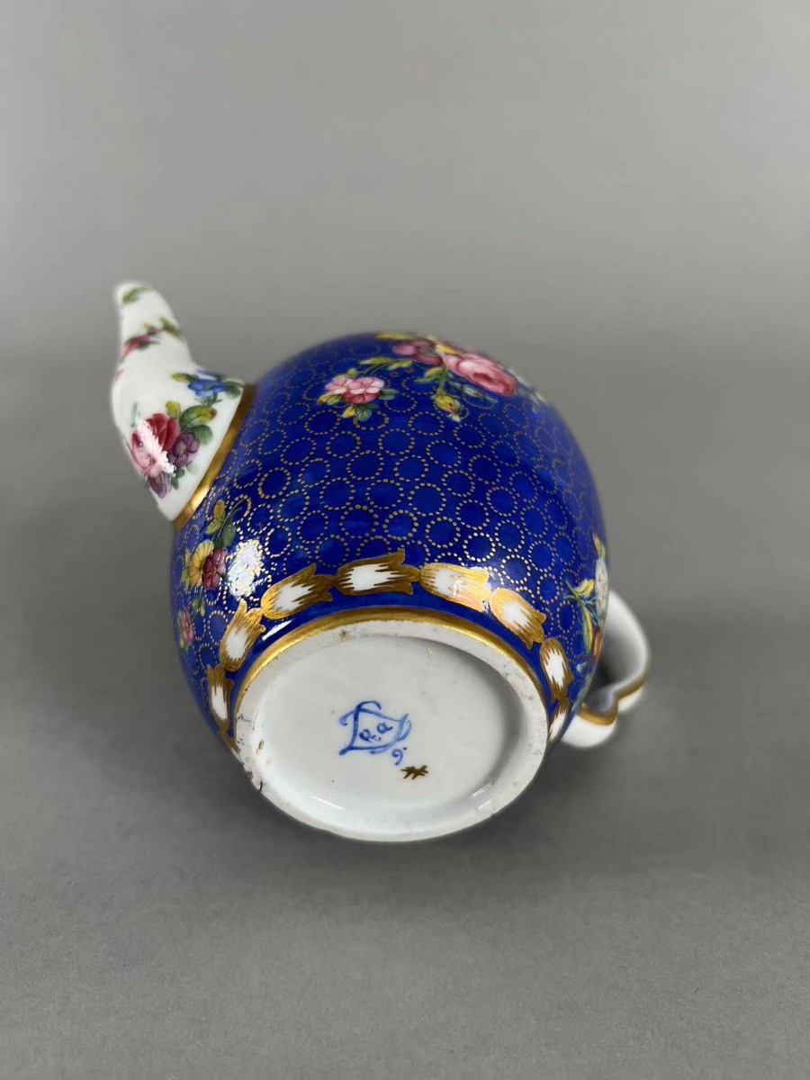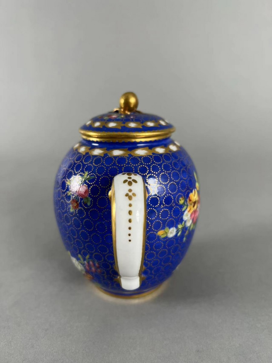 This soft-paste porcelain teapot was crafted by the Sèvres manufactory in 1778. The body is adorned with a deep “bleu nouveau” ground, finely overlaid with a regular pattern of gilt dots (“semis de points d’or”). Several vibrant floral bouquets, including roses, peonies, and daisies, are hand-painted by Charles-Nicolas Buteux, known for his floral compositions. The spout contrasts with a white ground and floral decoration. Lavish gilding on the lid and edges is attributed to Chauvaux.